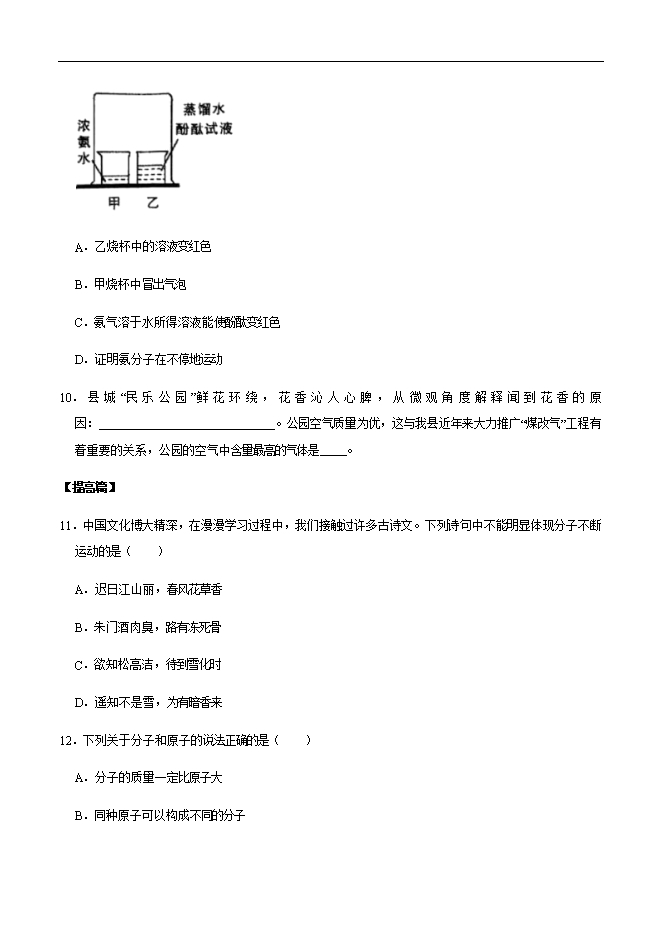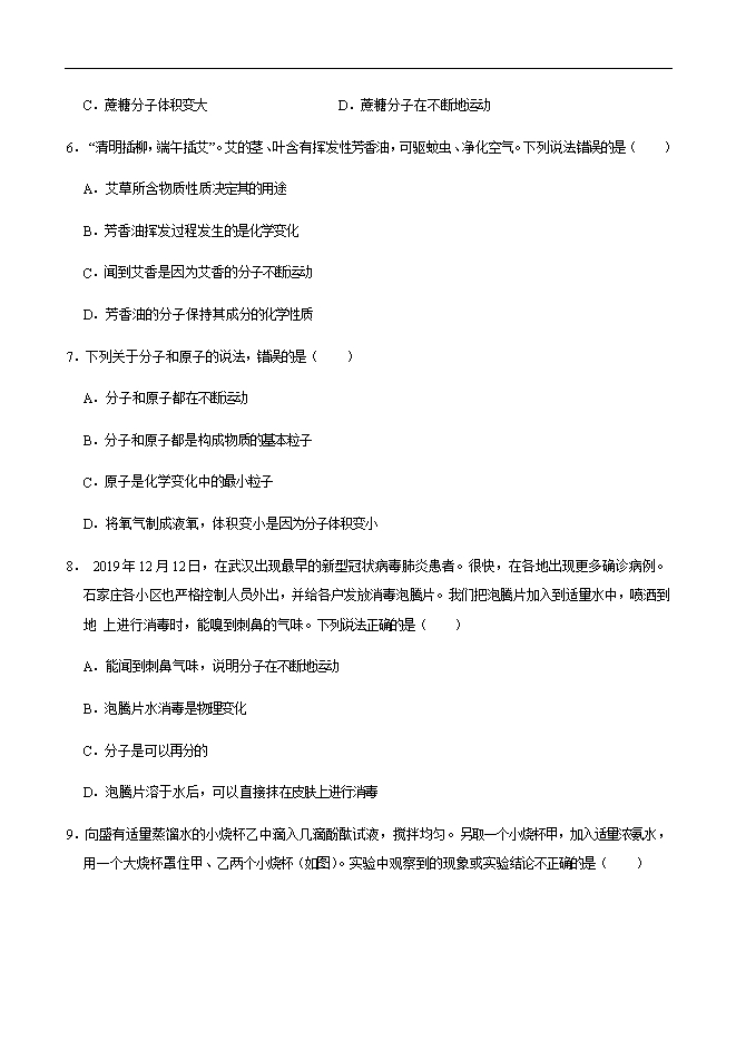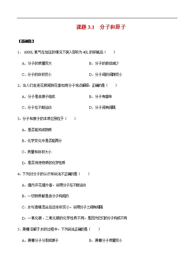 【内容简介】1. 6000L氧气在加压的情况下装入容积为40L的钢瓶后( )A.分子的质量变大 B.分子的数目减少 C.分子的体积变小 D.分子间的间隙变小2.当人们走进花房闻到花香如用分子观点解释,正确的是( )A.分子是由原子组成 B.分子有香味 C.分子在不断运动 D.分子间有间隔3.分子和原子的本质区别在于( )A.是否能构成物质 B.化学变化中是否能再分 C.质量和体积大小 D.是否保持物质的化学性质4.下列对分子的认识和说法不正确的是( )A.墙内开花墙外香,说明分子在不断运动 B.一切物质都是由分子构成的 C.水与酒精混合后总体积变小,说明分子之间有间隔 D.一氧化碳、二氧化碳的化学性质不同,是因为它们的分子构成不同5.蔗糖溶解于水的过程中,下列说法正确的是( )A.蔗糖分子分裂成原子 B.蔗糖分子质量变小 C.蔗糖分子体积变大 D.蔗糖分子在不断地运动6. “清明插柳,端午插艾”。艾的茎、叶含有挥发性芳香油,可驱蚊虫、净化空气。下列说法错误的是( )A.艾草所含物质性质决定其的用途 B.芳香油挥发过程发生的是化学变化 C.闻到艾香是因为艾香的分子不断运动 D.芳香油的分子保持其成分的化学性质7.下列关于分子和原子的说法,错误的是( )A.分子和原子都在不断运动 B.分子和原子都是构成物质的基本粒子 C.原子是化学变化中的最小粒子 ......