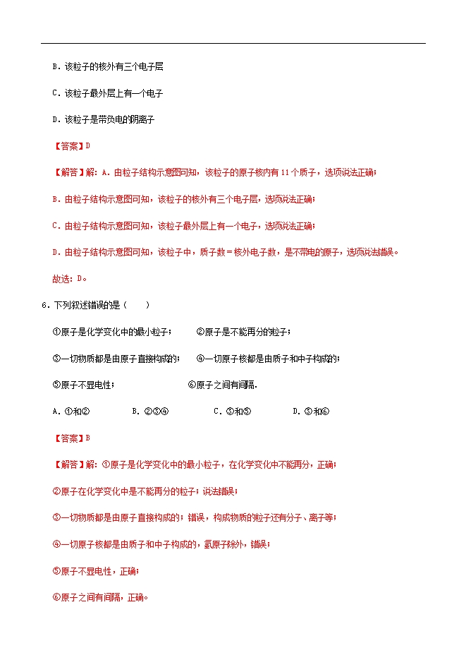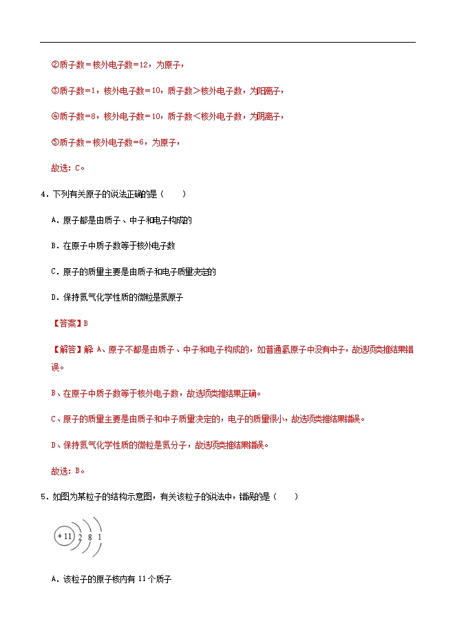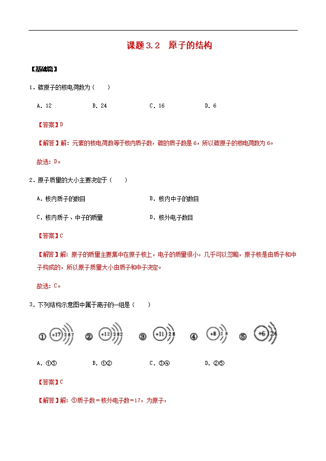 【内容简介】1.碳原子的核电荷数为( )A.12 B.24 C.16 D.6【答案】D【解答】解:元素的核电荷数等于核内质子数,碳的质子数是6,所以碳原子的核电荷数为6。故选:D。2.原子质量的大小主要决定于( )A.核内质子的数目 B.核内中子的数目 C.核内质子、中子的质量 D.核外电子数目【答案】C【解答】解:原子的质量主要集中在原子核上,电子的质量很小,几乎可以忽略,原子核是由质子和中子构成的,所以原子质量大小由质子和中子决定。故选:C。3.下列结构示意图中属于离子的一组是( ) A.①③ B.①② C.③④ D.②⑤【答案】C【解答】解:①质子数=核外电子数=17,为原子,②质子数=核外电子数=12,为原子,③质子数=1,核外电子数=10,质子数>核外电子数,为阳离子,④质子数=8,核外电子数=10,质子数<核外电子数,为阴离子,⑤质子数=核外电子数=6,为原子,故选:C。4.下列有关原子的说法正确的是( )A.原子都是由质子、中子和电子构成的 B.在原子中质子数等于核外电子数 C.原子的质量主要是由质子和电子质量决定的 D.保持氮气化学性质的微粒是氮原子【答案】B【解答】解:A、原子不都是由质子、中子和电子构成的,如普通氢原子中没有中子,故选项类推结果错误。B、在原子中质子数等于核外电子数,故选项类推结果正确。C、原子的质量主要是由质子和中子质量决定的,电子的质量很小,故选项类推结果错误。D、保持氮气化学性质的微粒是氮分子,故选项类推结果错误。故选:B。5.如图为某粒子的结构示意图,有关该粒子的说法中,错误的是( ) A.该粒子的原子核内有11个质子 ......
