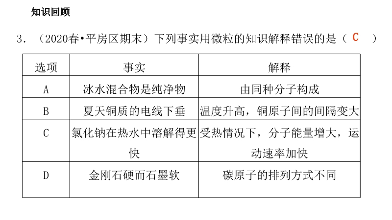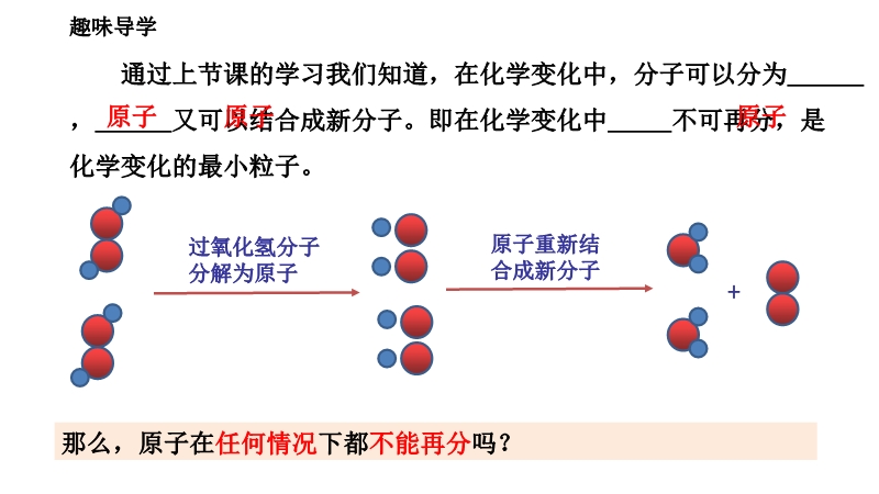 【内容简介】“不经一番寒彻骨,怎得梅花扑鼻香”,从微观角度分析,诗人能闻到梅花香气的主要原因是( )A.分子的体积和质量都很小 B.分子间有一定的间隔 C.分子在不断地运动 D.分子可以再分家庭用液化石油气是丙烷、丁烷等气体经加压后压缩到钢瓶中的,气体能被压缩的原因是( )A.分子质量和体积很小 B.分子体积变小 C.分子在不断运动 D.分子间有间隔通过上节课的学习我们知道,在化学变化中,分子可以分为 , 又可以结合成新分子。即在化学变化中 不可再分,是化学变化的最小粒子。“葡萄干布丁模型”认为,原子是一个平均分布着正电荷的圆球状粒子,而带负电荷的电子像一粒粒葡萄干一样镶嵌其中,中和了正电荷,从而形成了中性原子.1911年,卢瑟福通过精密的实验证明在原子中心有一个带正电的极小的核,电子在一个很大的空间绕核做高速旋转