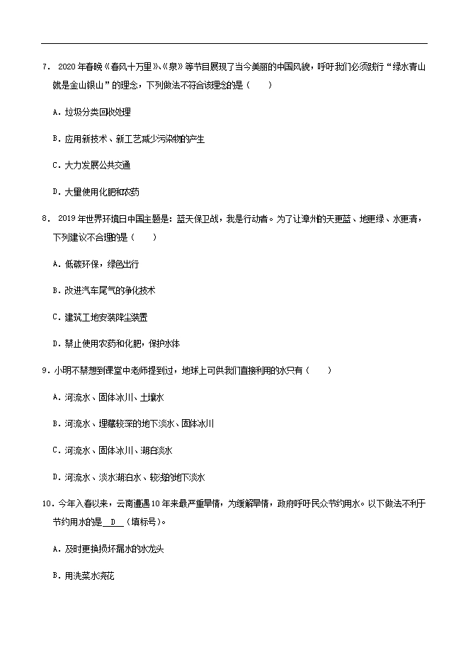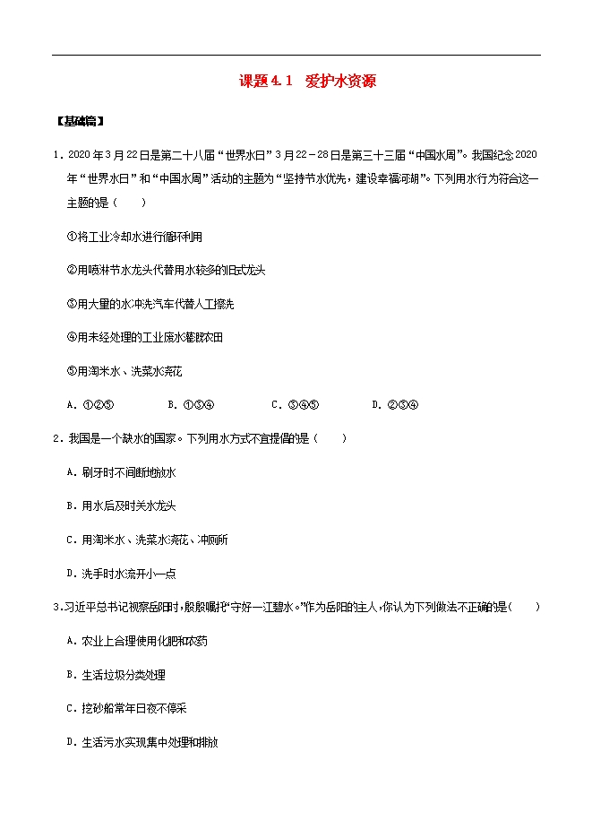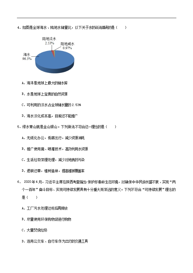 【内容简介】1.2020年3月22日是第二十八届“世界水日”3月22﹣28日是第三十三届“中国水周”。我国纪念2020年“世界水日”和“中国水周”活动的主题为“坚持节水优先,建设幸福河湖”。下列用水行为符合这一主题的是( )①将工业冷却水进行循环利用②用喷淋节水龙头代替用水较多的旧式龙头③用大量的水冲洗汽车代替人工擦洗④用未经处理的工业废水灌溉农田⑤用淘米水、洗菜水浇花A.①②⑤ B.①③④ C.③④⑤ D.②③④2.我国是一个缺水的国家。下列用水方式不宜提倡的是( )A.刷牙时不间断地放水 B.用水后及时关水龙头 C.用淘米水、洗菜水浇花、冲厕所 D.洗手时水流开小一点3.习近平总书记视察岳阳时,殷殷嘱托“守好一江碧水。”作为岳阳的主人,你认为下列做法不正确的是( )A.农业上合理使用化肥和农药 B.生活垃圾分类处理 C.挖砂船常年日夜不停采 D.生活污水实现集中处理和排放4.如图是全球海水、陆地水储量比,以下关于水的说法错误的是( ) A.海洋是地球上最大的储水库 B.水是地球上宝贵的自然资源 C.可利用的淡水占全球储水量的2.53% D.海水淡化成本高,目前还不能推广5.绿水青山就是金山银山。下列做法不符合这一理念的是( )A.无纸化办公,低碳出行,减少资源消耗 ......