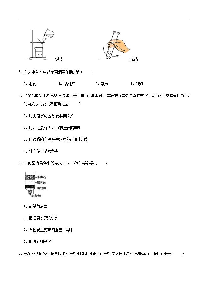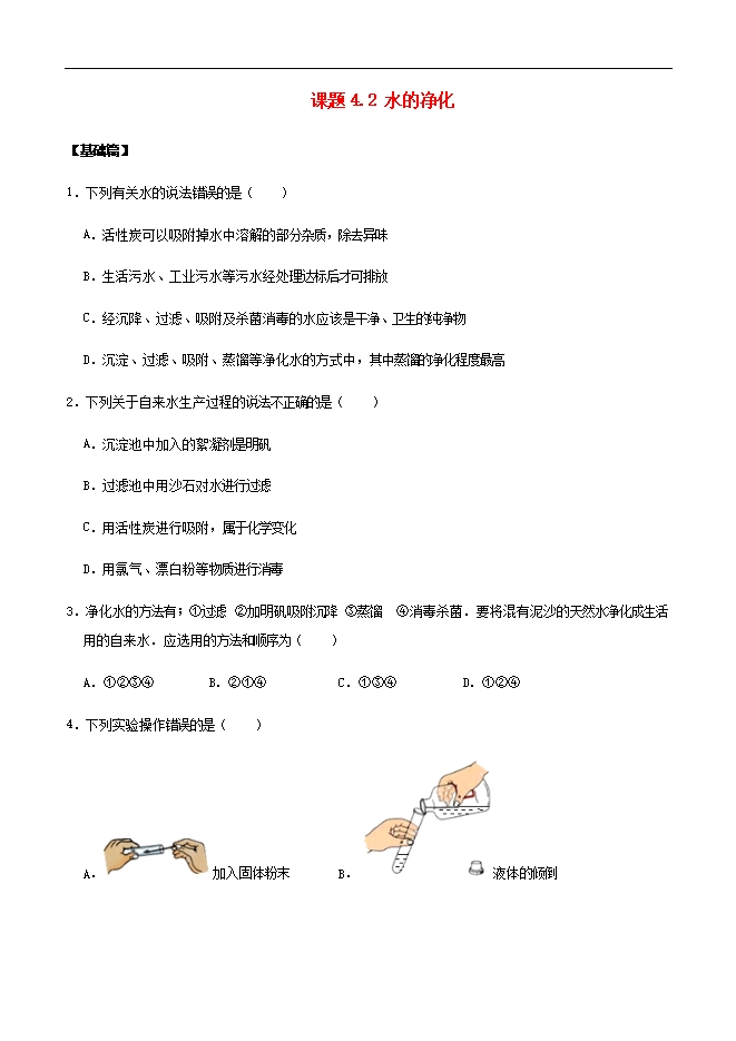 【内容简介】1.下列有关水的说法错误的是( )A.活性炭可以吸附掉水中溶解的部分杂质,除去异味 B.生活污水、工业污水等污水经处理达标后才可排放 C.经沉降、过滤、吸附及杀菌消毒的水应该是干净、卫生的纯净物 D.沉淀、过滤、吸附、蒸馏等净化水的方式中,其中蒸馏的净化程度最高2.下列关于自来水生产过程的说法不正确的是( )A.沉淀池中加入的絮凝剂是明矾 B.过滤池中用沙石对水进行过滤 C.用活性炭进行吸附,属于化学变化 D.用氯气、漂白粉等物质进行消毒3.净化水的方法有;①过滤 ②加明矾吸附沉降 ③蒸馏 ④消毒杀菌.要将混有泥沙的天然水净化成生活用的自来水.应选用的方法和顺序为( )A.①②③④ B.②①④ C.①③④ D.①②④4.下列实验操作错误的是( )......