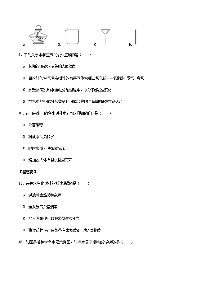 【精品】2021秋人教版初中化学《课题4.2 水的净化》基础和提高练习(原卷版)