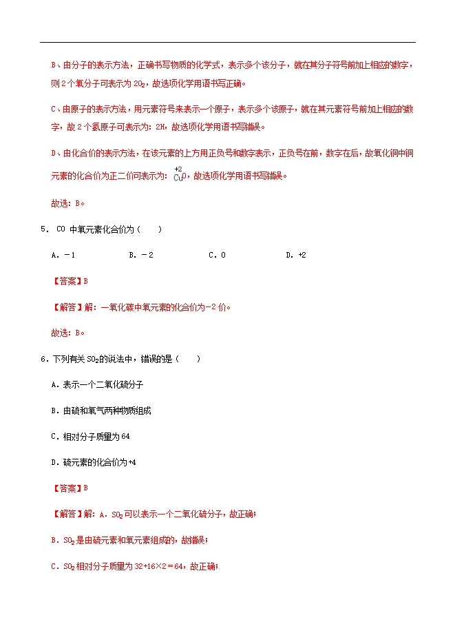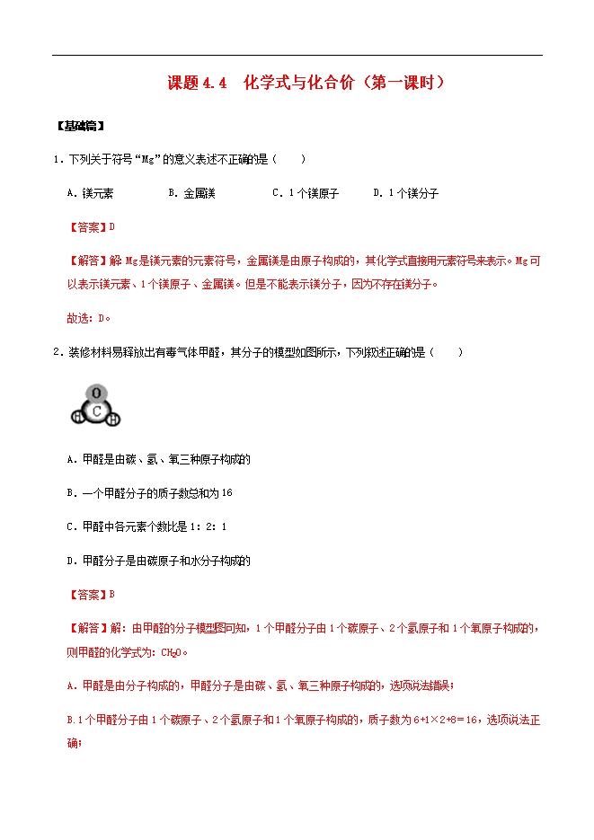 【内容简介】1.下列关于符号“Mg”的意义表述不正确的是( )A.镁元素 B.金属镁 C.1个镁原子 D.1个镁分子【答案】D【解答】解:Mg是镁元素的元素符号,金属镁是由原子构成的,其化学式直接用元素符号来表示。Mg可以表示镁元素、1个镁原子、金属镁。但是不能表示镁分子,因为不存在镁分子。故选:D。2.装修材料易释放出有毒气体甲醛,其分子的模型如图所示,下列叙述正确的是( ) A.甲醛是由碳、氢、氧三种原子构成的 B.一个甲醛分子的质子数总和为16 C.甲醛中各元素个数比是1:2:1 D.甲醛分子是由碳原子和水分子构成的【答案】B【解答】解:由甲醛的分子模型图可知,1个甲醛分子由1个碳原子、2个氢原子和1个氧原子构成的,则甲醛的化学式为:CH2O。A.甲醛是由分子构成的,甲醛分子是由碳、氢、氧三种原子构成的,选项说法错误;B.1个甲醛分子由1个碳原子、2个氢原子和1个氧原子构成的,质子数为6+1×2+8=16,选项说法正确;C.甲醛中C、H、O三种元素的质量比是12:(1×2):16=6:1:8≠1:2:1,选项说法错误;D.分子是由原子构成的,甲醛分子是由碳、氢、氧三种原子构成的,选项说法错误。故选:B。3.下列物质化学式书写错误的是( )A.铁(Fe) B.水(H2O) C.氢气(H) D.氯化钠(NaCl)【答案】C【解答】解:A、铁是由原子构成的单质,其化学式用元素符号表示,故选项化学式书写正确。B、1个水分子中含有2个H和1个O,其化学式为:H2O,故选项化学式书写正确。......