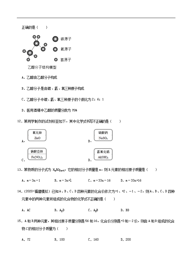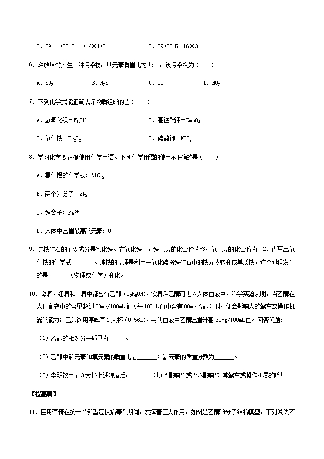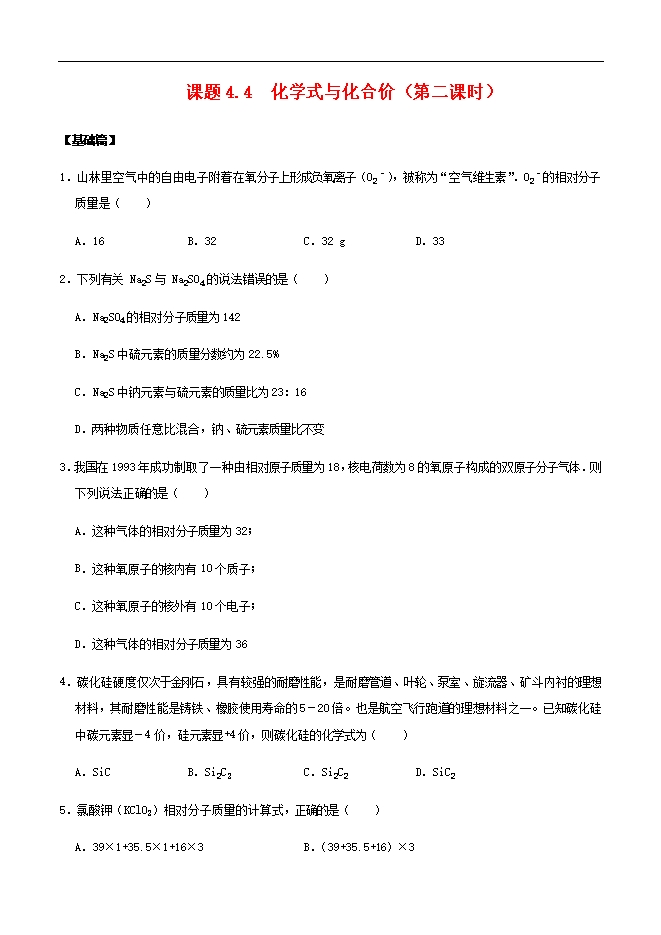 【内容简介】1.山林里空气中的自由电子附着在氧分子上形成负氧离子(O2﹣),被称为“空气维生素”.O2﹣的相对分子质量是( )A.16 B.32 C.32 g D.332.下列有关 Na2S与 Na2SO4的说法错误的是( )A.Na2SO4的相对分子质量为142 B.Na2S中硫元素的质量分数约为22.5% C.Na2S中钠元素与硫元素的质量比为23:16 D.两种物质任意比混合,钠、硫元素质量比不变3.我国在1993年成功制取了一种由相对原子质量为18,核电荷数为8的氧原子构成的双原子分子气体.则下列说法正确的是( )A.这种气体的相对分子质量为32; B.这种氧原子的核内有10个质子; C.这种氧原子的核外有10个电子; D.这种气体的相对分子质量为364.碳化硅硬度仅次于金刚石,具有较强的耐磨性能,是耐磨管道、叶轮、泵室、旋流器、矿斗内衬的理想材料,其耐磨性能是铸铁、橡胶使用寿命的5﹣20倍。也是航空飞行跑道的理想材料之一。已知碳化硅中碳元素显﹣4价,硅元素显+4价,则碳化硅的化学式为( )A.SiC B.Si2C3 C.Si2C2 D.SiC25.氯酸钾(KClO3)相对分子质量的计算式,正确的是( )A.39×1+35.5×1+16×3 B.(39+35.5+16)×3 C.39×1+35.5×1+16×1+3 D.39+35.5×16×36.燃放爆竹产生一种污染物,其元素质量比为1:1,该污染物为( )A.SO2 B.H2S C.CO D.NO27.下列化学式能正确表示物质组成的是( )A.氢氧化镁﹣MgOH B.高锰酸钾﹣KmnO4 C.氧化铁﹣Fe2O3 D.碳酸钾﹣KCO38.学习化学要正确使用化学用语。下列化学用语的使用不正确的是( )A.氯化铝的化学式:A1Cl2 B.两个氮分子:2N2 C.铁离子:Fe3+ D.人体中含量最高的元素:O9.赤铁矿石的主要成分是氧化铁。在氧化铁中,铁元素的化合价为+3,氧元素的化合价为﹣2.请写出氧化铁的化学式 。炼铁的原理是利用一氧化碳将铁矿石中的铁元素转变成单质铁,这个过程发生的是 (物理或化学)变化。10.啤酒、红酒和白酒中都含有乙醇(C2H5OH),饮酒后乙醇可进入人体血液中,科学实验表明,当乙醇在人体血液中的含量超过80mg/100mL血(每100mL血中含有80mg乙醇)时,便会影响人的驾车或操作机器的能力;已知饮用某啤酒1大杯(0.56L),会使血液中乙醇含量升高30mg/100mL血。回答问题:(1)乙醇的相对分子质量为 。......