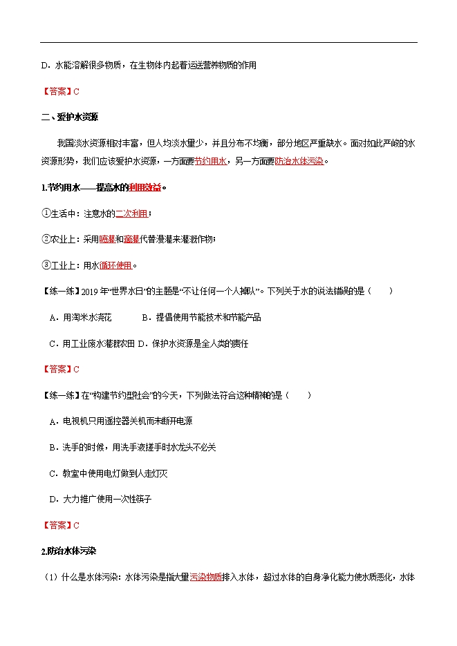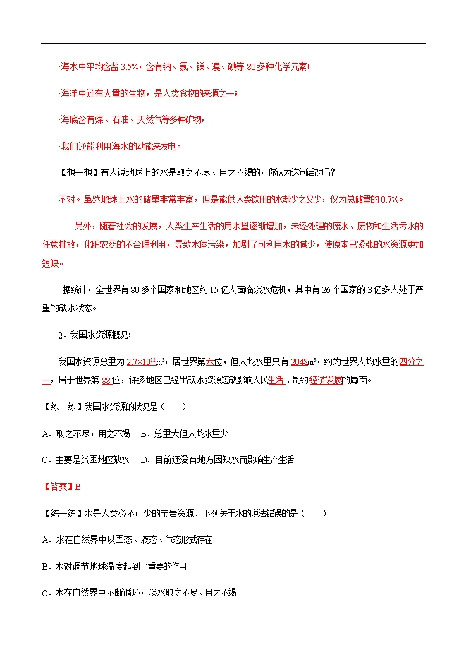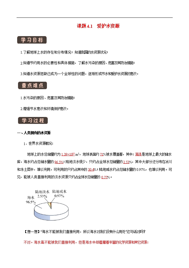 【内容简介】1.了解地球上水的存在和分布情况;知道我国的水资源状况;2.知道节约用水的必要性和具体措施,了解水污染的原因、危害及其防治措施;3.知道水资源短缺已成为一个全球性的问题,逐渐形成节水和爱护水资源的意识。 1.水污染的原因、危害及其防治措施;2.增强节水意识和环境保护意识。 一、人类拥有的水资源1.世界水资源概况:地球上的水总储量约为1.39×1018 m3,地球表面约71%被水覆盖着,其中:海洋是地球上最大的储水库,海水约占总储水量的96.5%;陆地淡水很少,只约占全球水总储量的2.53%,其中大部分还分布在冰川和冻土层中,难以利用,可利用的只约占其中的30.4%;陆地咸水约占总储水量的0.97%,也难以利用。可见,能被人类直接利用的淡水资源只约占全球水总储量的0.77%。 【想一想】“海水不能被我们直接利用,所以海水对我们没有什么用处”这句话对吗?不对。海水虽不能被我们直接利用,但是海水中却蕴藏着丰富的化学资源和其它资源:•海水中平均含盐3.5%,含有钠、氯、镁、溴、碘等80多种化学元素;•海洋中还有大量的生物,是人类食物的来源之一;•海底含有煤、石油、天然气等多种矿物,•我们还能利用海水的动能来发电。【想一想】有人说地球上的水是取之不尽、用之不竭的,你认为这句话对吗?不对。虽然地球上水的储量非常丰富,但是能供人类饮用的水却少之又少,仅为总储量的0.7%。 另外,随着社会的发展,人类生产生活的用水量逐渐增加,未经处理的废水、废物和生活污水的任意排放,化肥农药的不合理利用,导致水体污染,加剧了可利用水的减少,使原本已紧张的水资源更加短缺。......