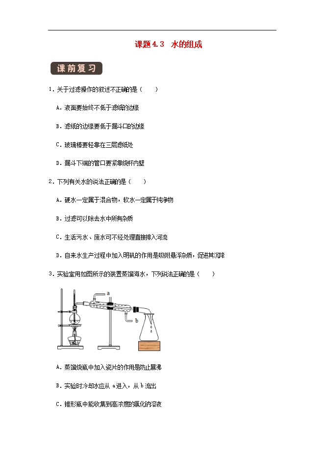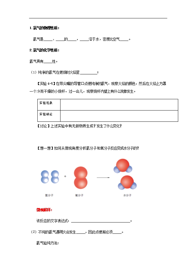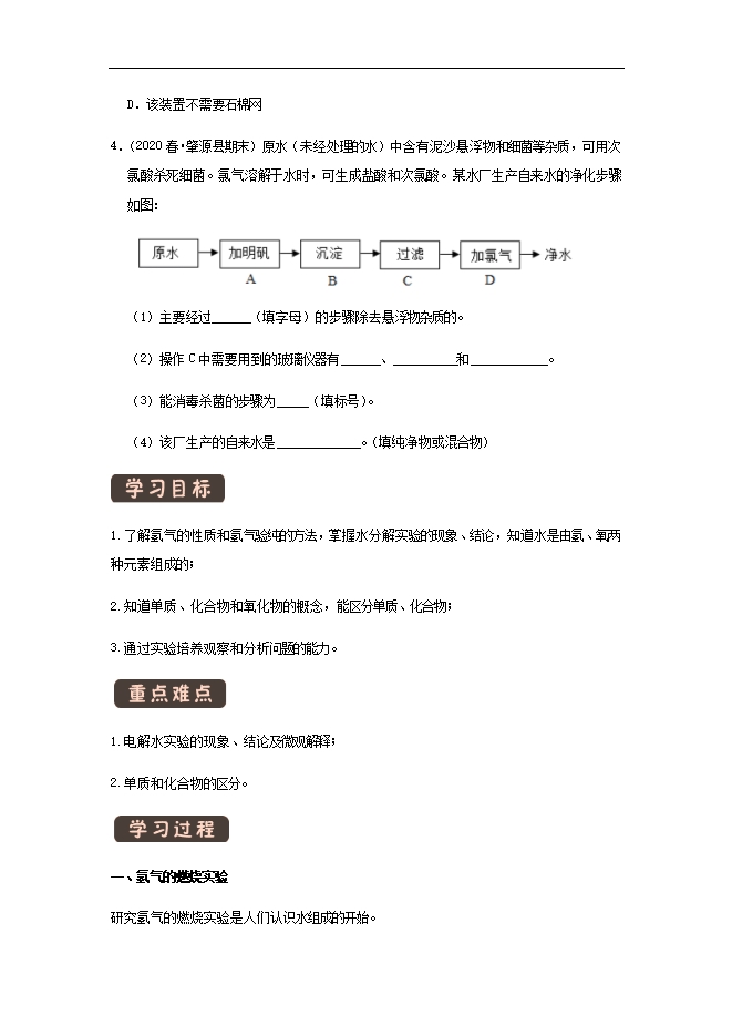 【内容简介】1.关于过滤操作的叙述不正确的是( )A.液面要始终不低于滤纸的边缘 B.滤纸的边缘要低于漏斗口的边缘 C.玻璃棒要轻靠在三层滤纸处 D.漏斗下端的管口要紧靠烧杯内壁2.下列有关水的说法正确的是( )A.硬水一定属于混合物,软水一定属于纯净物 B.过滤可以除去水中所有杂质 C.生活污水、废水可不经处理直接排入河流 D.自来水生产过程中加入明矾的作用是吸附悬浮杂质,促进其沉降3.实验室用如图所示的装置蒸馏海水,下列说法正确的是( ) A.蒸馏烧瓶中加入瓷片的作用是防止暴沸 B.实验时冷却水应从a进入,从b流出 C.锥形瓶中能收集到高浓度的氯化钠溶液 D.该装置不需要石棉网4.(2020春•肇源县期末)原水(未经处理的水)中含有泥沙悬浮物和细菌等杂质,可用次氯酸杀死细菌。氯气溶解于水时,可生成盐酸和次氯酸。某水厂生产自来水的净化步骤如图: (1)主要经过 (填字母)的步骤除去悬浮物杂质的。(2)操作C中需要用到的玻璃仪器有 、 和 。(3)能消毒杀菌的步骤为 (填标号)。(4)该厂生产的自来水是 。(填纯净物或混合物) 1.了解氢气的性质和氢气验纯的方法,掌握水分解实验的现象、结论,知道水是由氢、氧两种元素组成的;2.知道单质、化合物和氧化物的概念,能区分单质、化合物;3.通过实验培养观察和分析问题的能力。 1.电解水实验的现象、结论及微观解释;2.单质和化合物的区分。 一、氢气的燃烧实验研究氢气的燃烧实验是人们认识水组成的开始。1.氢气的物理性质:氢气是 、 的 , 溶于水,密度比空气 。2.氢气的化学性质:氢气具有 性。(1)纯净的氢气在燃烧时火焰呈 ;【实验4-5】在带尖嘴的导管口点燃纯净的氢气,观察火焰的颜色,然后在火焰上方罩一个冷而干燥的小烧杯,过一会儿,观察烧杯内壁上有什么现象发生。实验现象 实验结论 【讨论】上述实验中有无新物质生成?发生了什么变化?【想一想】如何从微观角度分析氢分子和氧分子反应变成水分子的?......