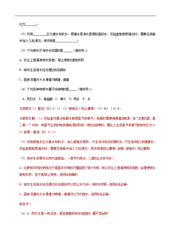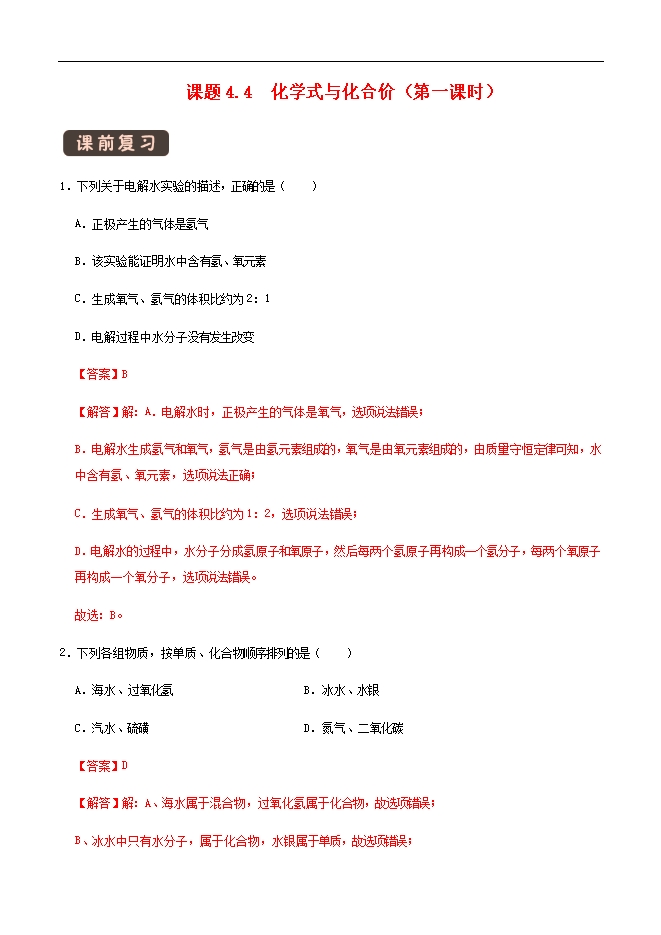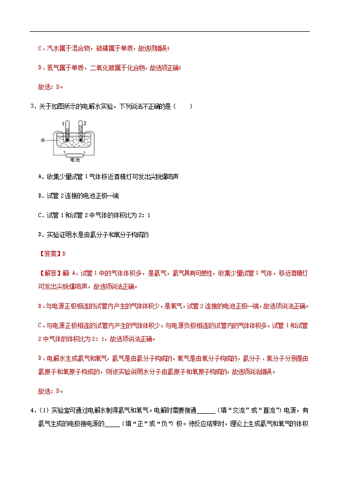 【内容简介】1.下列关于电解水实验的描述,正确的是( )A.正极产生的气体是氢气 B.该实验能证明水中含有氢、氧元素 C.生成氧气、氢气的体积比约为2:1 D.电解过程中水分子没有发生改变【答案】B【解答】解:A.电解水时,正极产生的气体是氧气,选项说法错误;B.电解水生成氢气和氧气,氢气是由氢元素组成的,氧气是由氧元素组成的,由质量守恒定律可知,水中含有氢、氧元素,选项说法正确;C.生成氧气、氢气的体积比约为1:2,选项说法错误;D.电解水的过程中,水分子分成氢原子和氧原子,然后每两个氢原子再构成一个氢分子,每两个氧原子再构成一个氧分子,选项说法错误。故选:B。2.下列各组物质,按单质、化合物顺序排列的是( )A.海水、过氧化氢 B.冰水、水银 C.汽水、硫磺 D.氮气、二氧化碳【答案】D【解答】解:A、海水属于混合物,过氧化氢属于化合物,故选项错误;B、冰水中只有水分子,属于化合物,水银属于单质,故选项错误;C、汽水属于混合物,硫磺属于单质,故选项错误;D、氮气属于单质,二氧化碳属于化合物,故选项正确;故选:D。3.关于如图所示的电解水实验,下列说法不正确的是( ) A.收集少量试管1气体移近酒精灯可发出尖锐爆鸣声 B.试管2连接的电池正极一端 C.试管1和试管2中气体的体积比为2:1 D.实验证明水是由氢分子和氧分子构成的【答案】D【解答】解:A、试管1中的气体体积多,是氢气,氢气具有可燃性,收集少量试管1气体,移近酒精灯可发出尖锐爆鸣声,故选项说法正确。B、与电源正极相连的试管内产生的气体体积少,是氧气,试管2连接的电池正极一端,故选项说法正确。C、与电源正极相连的试管内产生的气体体积少,与电源负极相连的试管内的气体体积多,试管1和试管2中气体的体积比为2:1,故选项说法正确。D、电解水生成氢气和氧气,氢气是由氢分子构成的,氧气是由氧分子构成的,氢分子、氧分子分别是由......