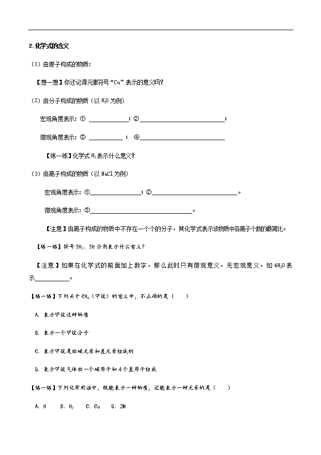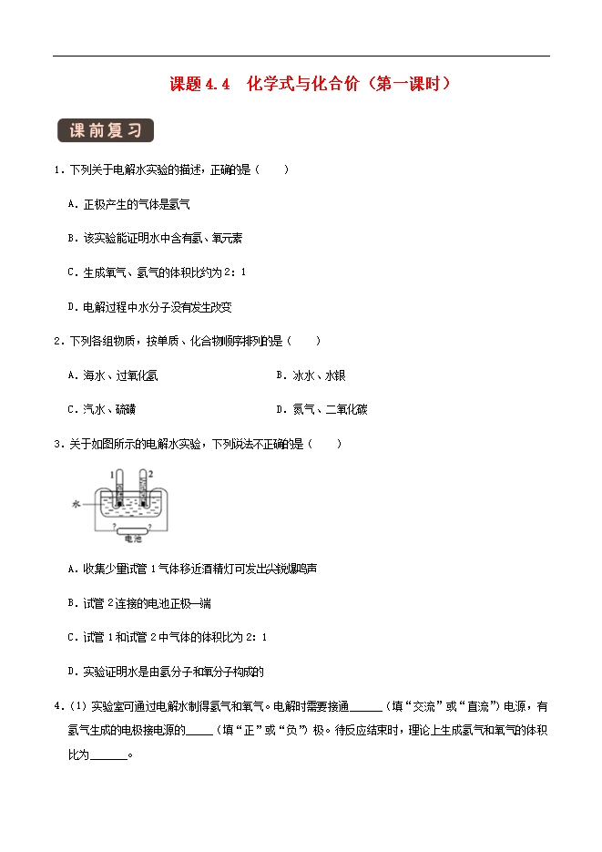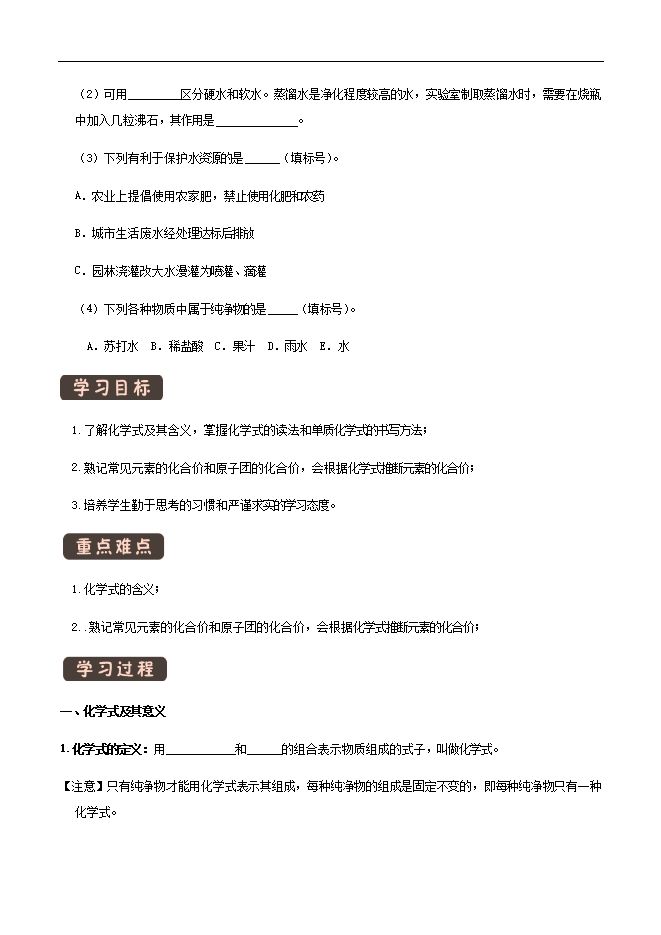 【内容简介】1.下列关于电解水实验的描述,正确的是( )A.正极产生的气体是氢气 B.该实验能证明水中含有氢、氧元素 C.生成氧气、氢气的体积比约为2:1 D.电解过程中水分子没有发生改变2.下列各组物质,按单质、化合物顺序排列的是( )A.海水、过氧化氢 B.冰水、水银 C.汽水、硫磺 D.氮气、二氧化碳3.关于如图所示的电解水实验,下列说法不正确的是( ) A.收集少量试管1气体移近酒精灯可发出尖锐爆鸣声 B.试管2连接的电池正极一端 C.试管1和试管2中气体的体积比为2:1 D.实验证明水是由氢分子和氧分子构成的4.(1)实验室可通过电解水制得氢气和氧气。电解时需要接通 (填“交流”或“直流”)电源,有氢气生成的电极接电源的 (填“正”或“负”)极。待反应结束时,理论上生成氢气和氧气的体积比为 。(2)可用 区分硬水和软水。蒸馏水是净化程度较高的水,实验室制取蒸馏水时,需要在烧瓶中加入几粒沸石,其作用是 。(3)下列有利于保护水资源的是 (填标号)。A.农业上提倡使用农家肥,禁止使用化肥和农药B.城市生活废水经处理达标后排放C.园林浇灌改大水漫灌为喷灌、滴灌(4)下列各种物质中属于纯净物的是 (填标号)。A.苏打水 B.稀盐酸 C.果汁 D.雨水 E.水 1.了解化学式及其含义,掌握化学式的读法和单质化学式的书写方法;2.熟记常见元素的化合价和原子团的化合价,会根据化学式推断元素的化合价;3.培养学生勤于思考的习惯和严谨求实的学习态度。 1.化学式的含义;2..熟记常见元素的化合价和原子团的化合价,会根据化学式推断元素的化合价; 一、化学式及其意义1.化学式的定义:用 和 的组合表示物质组成的式子,叫做化学式。【注意】只有纯净物才能用化学式表示其组成,每种纯净物的组成是固定不变的,即每种纯净物只有一种化学式。......