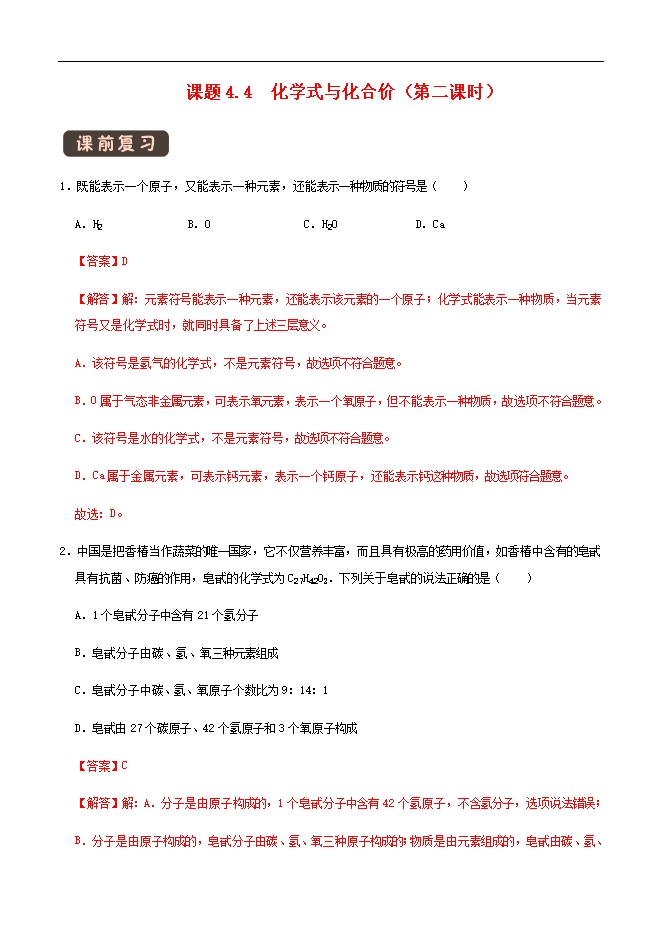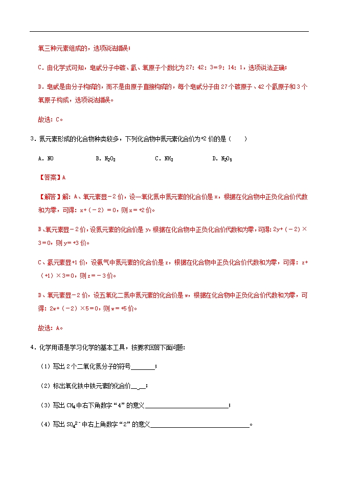 【内容简介】1.既能表示一个原子,又能表示一种元素,还能表示一种物质的符号是( )A.H2 B.O C.H2O D.Ca【答案】D【解答】解:元素符号能表示一种元素,还能表示该元素的一个原子;化学式能表示一种物质,当元素符号又是化学式时,就同时具备了上述三层意义。A.该符号是氢气的化学式,不是元素符号,故选项不符合题意。B.O属于气态非金属元素,可表示氧元素,表示一个氧原子,但不能表示一种物质,故选项不符合题意。C.该符号是水的化学式,不是元素符号,故选项不符合题意。D.Ca属于金属元素,可表示钙元素,表示一个钙原子,还能表示钙这种物质,故选项符合题意。故选:D。2.中国是把香椿当作蔬菜的唯一国家,它不仅营养丰富,而且具有极高的药用价值,如香椿中含有的皂甙具有抗菌、防癌的作用,皂甙的化学式为C27H42O3.下列关于皂甙的说法正确的是( )A.1个皂甙分子中含有21个氢分子 B.皂甙分子由碳、氢、氧三种元素组成 C.皂甙分子中碳、氢、氧原子个数比为9:14:1 D.皂甙由27个碳原子、42个氢原子和3个氧原子构成【答案】C【解答】解:A.分子是由原子构成的,1个皂甙分子中含有42个氢原子,不含氢分子,选项说法错误;B.分子是由原子构成的,皂甙分子由碳、氢、氧三种原子构成的;物质是由元素组成的,皂甙由碳、氢、氧三种元素组成的,选项说法错误;C.由化学式可知,皂甙分子中碳、氢、氧原子个数比为27:42:3=9:14:1,选项说法正确;D.皂甙是由分子构成的,而不是由原子直接构成的,每个皂甙分子由27个碳原子、42个氢原子和3个氧原子构成,选项说法错误。故选:C。3.氮元素形成的化合物种类较多,下列化合物中氮元素化合价为+2价的是( )A.NO B.N2O3 C.NH3 D.N2O5【答案】A【解答】解:A、氧元素显﹣2价,设一氧化氮中氮元素的化合价是x,根据在化合物中正负化合价代数和为零,可得:x+(﹣2)=0,则x=+2价。B、氧元素显﹣2价,设氮元素的化合价是y,根据在化合物中正负化合价代数和为零,可得:2y+(﹣2)×3=0,则y=+3价。C、氢元素显+1价,设氨气中氮元素的化合价是z,根据在化合物中正负化合价代数和为零,可得:z+(+1)×3=0,则z=﹣3价。D、氧元素显﹣2价,设五氧化二氮中氮元素的化合价是w,根据在化合物中正负化合价代数和为零,可得:2w+(﹣2)×5=0,则w=+5价。故选:A。4.化学用语是学习化学的基本工具,按要求回答下面问题:(1)写出2个二氧化氮分子的符号 ;(2)标出氧化铁中铁元素的化合价 ;(3)写出CH4中右下角数字“4”的意义 ;(4)写出SO42﹣中右上角数字“2”的意义 。......