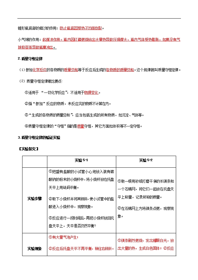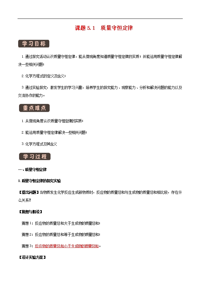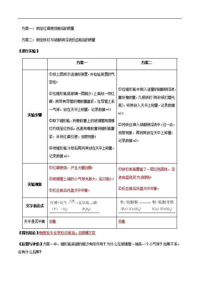 【内容简介】1.通过探究活动认识质量守恒定律,能从微观角度知道质量守恒定律的实质;并能运用质量守恒定律解决一些相关问题;2.化学方程式的定义及含义;3.通过实验探究,激发学生的学习兴趣,培养学生的探究能力、观察能力、分析和解决问题的能力以及交流协作的能力。 1.从微观角度认识质量守恒定律的实质;2.能运用质量守恒定律解决一些相关问题;3.化学方程式及其含义 一、质量守恒定律1.质量守恒定律的探究实验【提出问题】当物质发生化学反应生成新物质时,反应物的质量总和与生成物的质量总和相比较,存在什么关系?【猜想与假设】猜想1:反应物的质量总和大于生成物的质量总和;猜想2:反应物的质量总和等于生成物的质量总和;猜想3:反应物的质量总和小于生成物的质量总和。【设计实验方案】方案一:测定红磷燃烧前后的质量方案二:测定铁钉与硫酸铜溶液反应前后的质量【进行实验】......