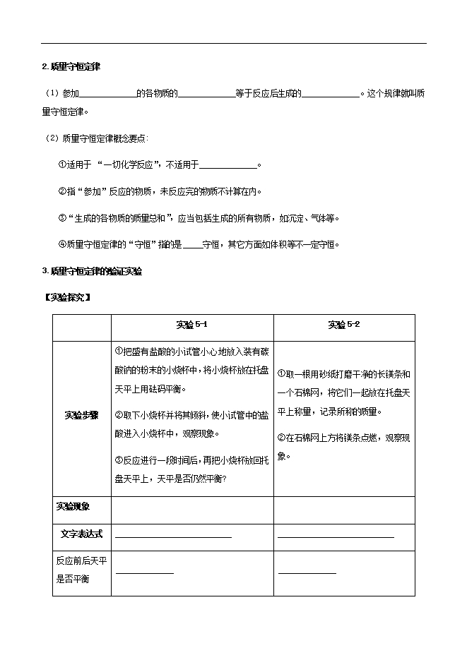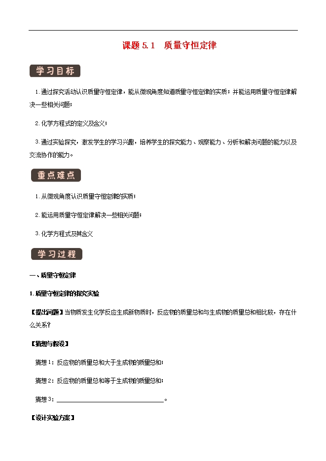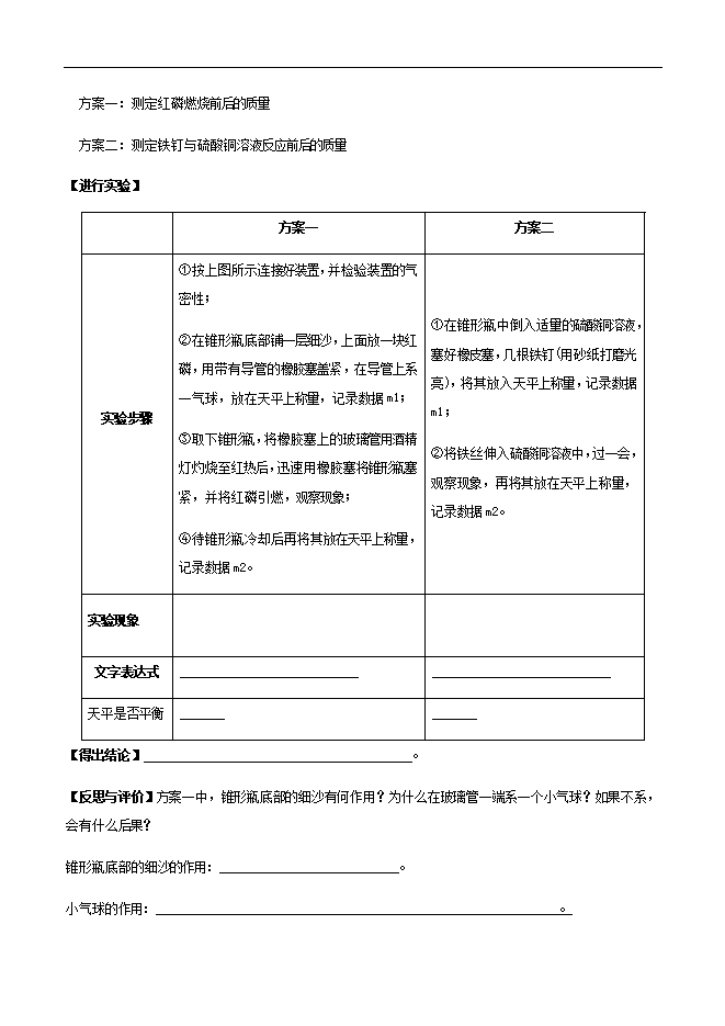 【内容简介】1.通过探究活动认识质量守恒定律,能从微观角度知道质量守恒定律的实质;并能运用质量守恒定律解决一些相关问题;2.化学方程式的定义及含义;3.通过实验探究,激发学生的学习兴趣,培养学生的探究能力、观察能力、分析和解决问题的能力以及交流协作的能力。 1.从微观角度认识质量守恒定律的实质;2.能运用质量守恒定律解决一些相关问题;3.化学方程式及其含义 一、质量守恒定律1.质量守恒定律的探究实验【提出问题】当物质发生化学反应生成新物质时,反应物的质量总和与生成物的质量总和相比较,存在什么关系?【猜想与假设】猜想1:反应物的质量总和大于生成物的质量总和;猜想2:反应物的质量总和等于生成物的质量总和;猜想3: 。【设计实验方案】方案一:测定红磷燃烧前后的质量方案二:测定铁钉与硫酸铜溶液反应前后的质量【进行实验】 方案一 方案二实验步骤 ①按上图所示连接好装置,并检验装置的气密性;②在锥形瓶底部铺一层细沙,上面放一块红磷,用带有导管的橡胶塞盖紧,在导管上系一气球,放在天平上称量,记录数据m1;③取下锥形瓶,将橡胶塞上的玻璃管用酒精灯灼烧至红热后,迅速用橡胶塞将锥形瓶塞紧,并将红磷引燃,观察现象;④待锥形瓶冷却后再将其放在天平上称量,记录数据m2。 ①在锥形瓶中倒入适量的硫酸铜溶液,塞好橡皮塞,几根铁钉(用砂纸打磨光亮),将其放入天平上称量,记录数据m1;②将铁丝伸入硫酸铜溶液中,过一会,观察现象,再将其放在天平上称量,记录数据m2。......