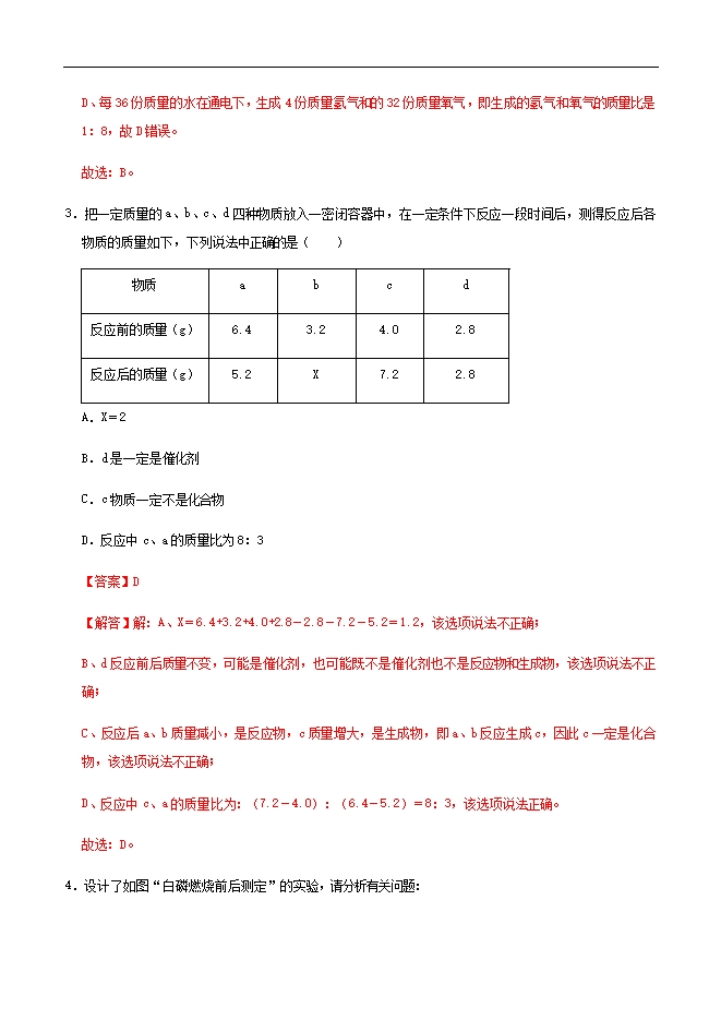 【内容简介】1.石灰氮(化学式为CaCN2)是一种固态肥料,遇水发生反应的化学方程式为CaCN2+3H2O═CaCO3+2X,则X化学式为( )A.NO B.N2 C.CO2 D.NH3【答案】D【解答】解:由质量守恒定律:反应前后,原子种类、数目均不变,由反应的化学方程式,反应前钙、碳、氢、氮、氢、氧原子个数分别为1、1、2、6、3,反应后的生成物中钙、碳、氢、氮、氢、氧原子个数分别为1、1、0、0、3,根据反应前后原子种类、数目不变,则2X分子中含有2个氮原子和6个氢原子,则每个X分子由1个氮原子和3个原子构成,则物质X的化学式为NH3。故选:D。2.由化学方程式2H2O 2H2↑+O2↑获得的下列信息中,正确的是( )A.水中含有氢气和氧气 B.该反应属于分解反应 C.水是由2个氢原子和1个氧原子构成的 D.电解生成的氢气和氧气的质量比是2:1【答案】B【解答】解:A、水中含有氢元素和氧元素,而不是氢气和氧气,故A错误;B、水在通电的时,生成氢气和氧气,符合“一变多”,属于分解反应,故B正确;C、1个水分子而不是水是由2个氢原子和1个氧原子构成的,故C错误;D、每36份质量的水在通电下,生成4份质量氢气和的32份质量氧气,即生成的氢气和氧气的质量比是1:8,故D错误。故选:B。3.把一定质量的a、b、c、d四种物质放入一密闭容器中,在一定条件下反应一段时间后,测得反应后各物质的质量如下,下列说法中正确的是( )物质 a b c d反应前的质量(g) 6.4 3.2 4.0 2.8反应后的质量(g) 5.2 X 7.2 2.8A.X=2 B.d是一定是催化剂 C.c物质一定不是化合物 D.反应中c、a的质量比为8:3【答案】D【解答】解:A、X=6.4+3.2+4.0+2.8﹣2.8﹣7.2﹣5.2=1.2,该选项说法不正确;B、d反应前后质量不变,可能是催化剂,也可能既不是催化剂也不是反应物和生成物,该选项说法不正确;C、反应后a、b质量减小,是反应物,c质量增大,是生成物,即a、b反应生成c,因此c一定是化合物,该选项说法不正确;......
