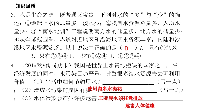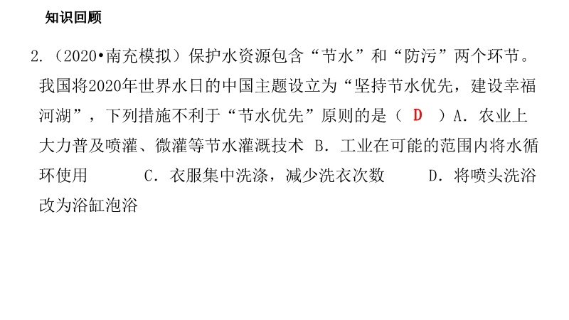 【内容简介】保护水资源包含“节水”和“防污”两个环节。我国将2020年世界水日的中国主题设立为“坚持节水优先,建设幸福河湖”,下列措施不利于“节水优先”原则的是( )A.农业上大力普及喷灌、微灌等节水灌溉技术B.工业在可能的范围内将水循环使用C.衣服集中洗涤,减少洗衣次数D.将喷头洗浴改为浴缸泡浴水是生命之源,既普通又宝贵。下列对水的“多”与“少”的描述:①地球上水的总量多,淡水少;②我国水资源总量多,人均水量少;③“南水北调”工程说明南方水的储量多,北方水的储量少;④从全球范围看,赤道附近地区和沿海地区水资源丰富,内陆和沙漠地区水资源贫乏。以上说法中正确的是( )A.只有①②③B.只有②③④C.只有①③④D.①②③④静置沉淀和吸附沉淀除去的是难溶性的杂质,其中吸附沉淀效果更好。滤纸破损;或滤液边缘高于滤纸边缘;或仪器不干净等......