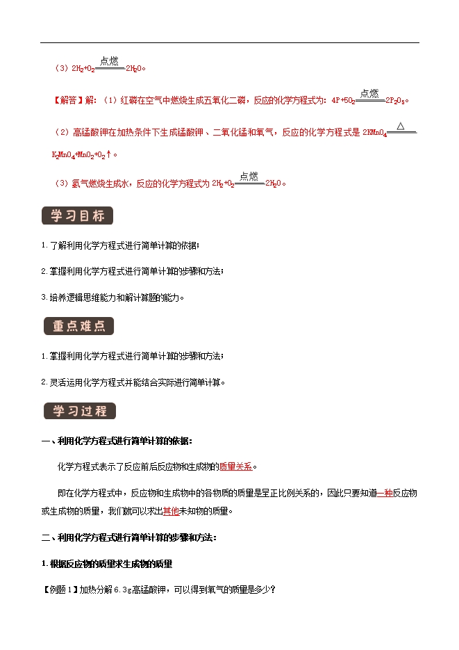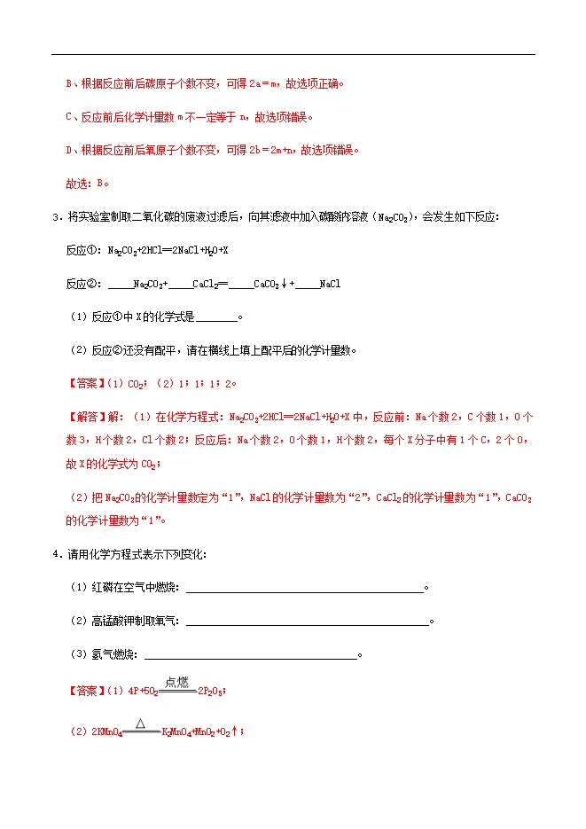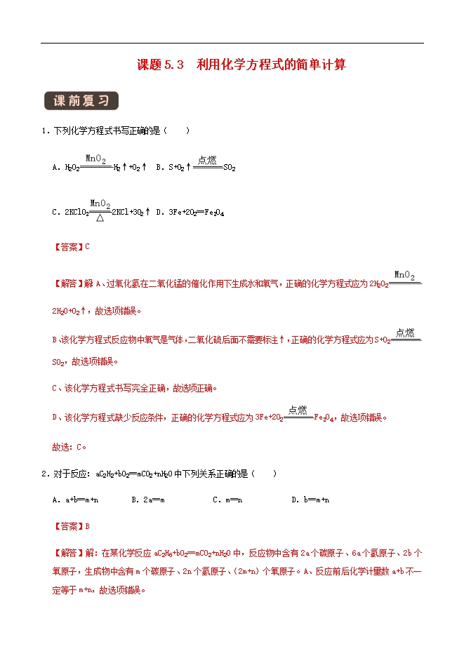 【内容简介】1.下列化学方程式书写正确的是( )A.H2O2 H2↑+O2↑B.S+O2↑ SO2C.2KClO3 2KCl+3O2↑D.3Fe+2O2═Fe3O4【答案】C【解答】解:A、过氧化氢在二氧化锰的催化作用下生成水和氧气,正确的化学方程式应为2H2O2 2H2O+O2↑,故选项错误。B、该化学方程式反应物中氧气是气体,二氧化硫后面不需要标注↑,正确的化学方程式应为S+O2 SO2,故选项错误。C、该化学方程式书写完全正确,故选项正确。D、该化学方程式缺少反应条件,正确的化学方程式应为3Fe+2O2 Fe3O4,故选项错误。故选:C。2.对于反应:aC2H2+bO2═mCO2+nH2O中下列关系正确的是( )A.a+b═m+nB.2a═mC.m═nD.b═m+n【答案】B【解答】解:在某化学反应aC2H6+bO2═mCO2+nH2O中,反应物中含有2a个碳原子、6a个氢原子、2b个氧原子,生成物中含有m个碳原子、2n个氢原子、(2m+n)个氧原子。A、反应前后化学计量数a+b不一定等于m+n,故选项错误。B、根据反应前后碳原子个数不变,可得2a=m,故选项正确。C、反应前后化学计量数m不一定等于n,故选项错误。D、根据反应前后氧原子个数不变,可得2b=2m+n,故选项错误。故选:B。3.将实验室制取二氧化碳的废液过滤后,向其滤液中加入碳酸钠溶液(Na2CO3),会发生如下反应:反应①:Na2CO3+2HCl═2NaCl+H2O+X反应②: Na2CO3+ CaCl2═ CaCO3↓+ NaCl(1)反应①中X的化学式是 。(2)反应②还没有配平,请在横线上填上配平后的化学计量数。【答案】(1)CO2;(2)1;1;1;2。【解答】解:(1)在化学方程式:Na2CO3+2HCl═2NaCl+H2O+X中,反应前:Na个数2,C个数1,O个数3,H个数2,Cl个数2;反应后:Na个数2,O个数1,H个数2,每个X分子中有1个C,2个O,故X的化学式为CO2;(2)把Na2CO3的化学计量数定为“1”,NaCl的化学计量数为“2”,CaCl2的化学计量数为“1”,CaCO3的化学计量数为“1”。4.请用化学方程式表示下列变化:(1)红磷在空气中燃烧: 。......