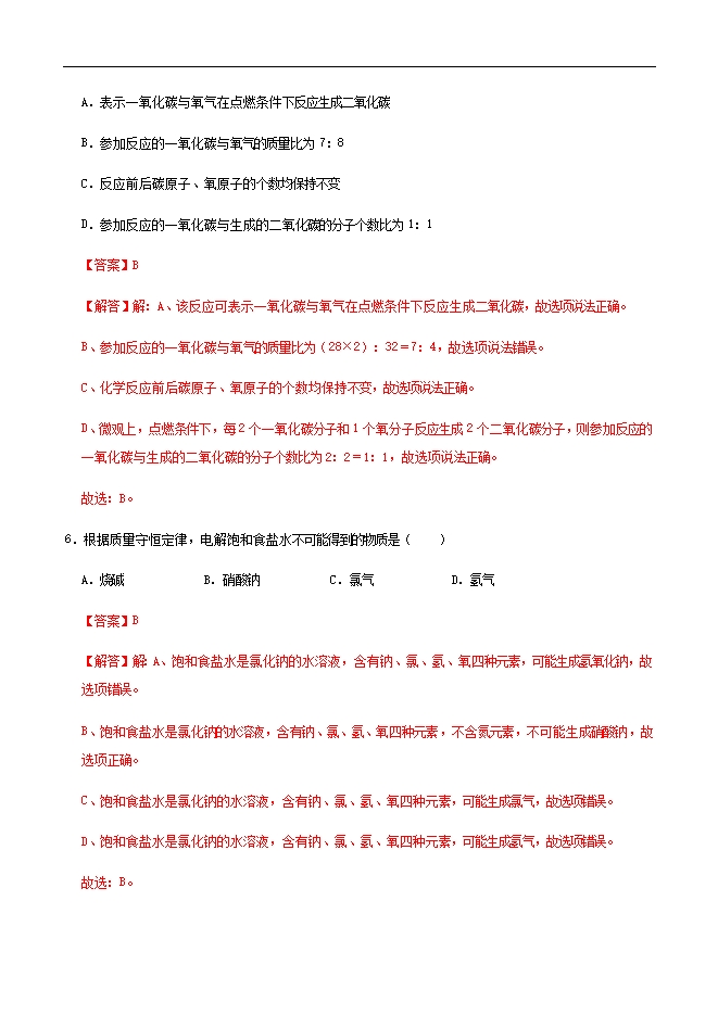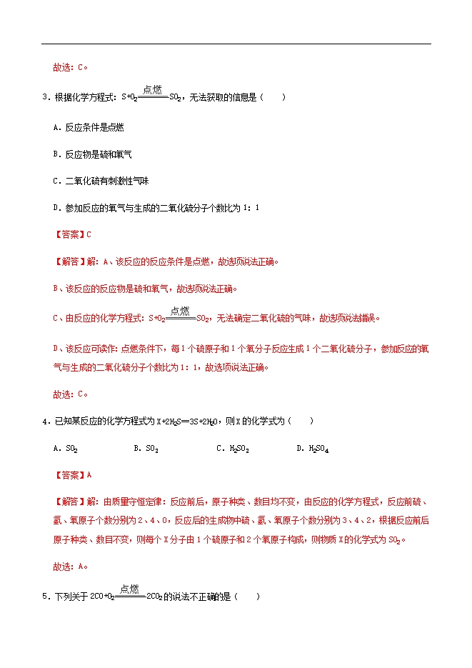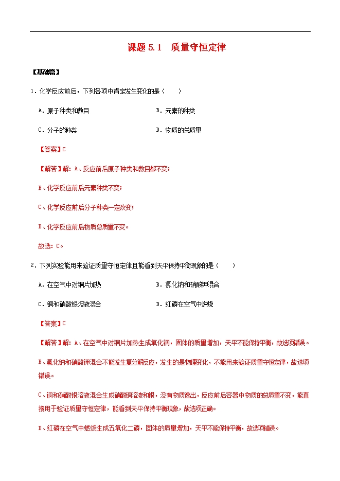 【内容简介】.化学反应前后,下列各项中肯定发生变化的是( )A.原子种类和数目B.元素的种类C.分子的种类D.物质的总质量【答案】C【解答】解:A、反应前后原子种类和数目都不变;B、化学反应前后元素种类不变;C、化学反应前后分子种类一定改变;D、化学反应前后物质总质量不变。故选:C。2.下列实验能用来验证质量守恒定律且能看到天平保持平衡现象的是( )A.在空气中对铜片加热B.氯化钠和硝酸钾混合C.铜和硝酸银溶液混合D.红磷在空气中燃烧【答案】C【解答】解:A、在空气中对铜片加热生成氧化铜,固体的质量增加,天平不能保持平衡,故选项错误。B、氯化钠和硝酸钾混合不能发生复分解反应,发生的是物理变化,不能用来验证质量守恒定律,故选项错误。C、铜和硝酸银溶液混合生成硝酸铜溶液和银,没有物质逸出,反应前后容器中物质的总质量不变,能直接用于验证质量守恒定律,能看到天平保持平衡现象,故选项正确。D、红磷在空气中燃烧生成五氧化二磷,固体的质量增加,天平不能保持平衡,故选项错误。故选:C。3.根据化学方程式:S+O2 SO2,无法获取的信息是( )A.反应条件是点燃B.反应物是硫和氧气C.二氧化硫有刺激性气味D.参加反应的氧气与生成的二氧化硫分子个数比为1:1......