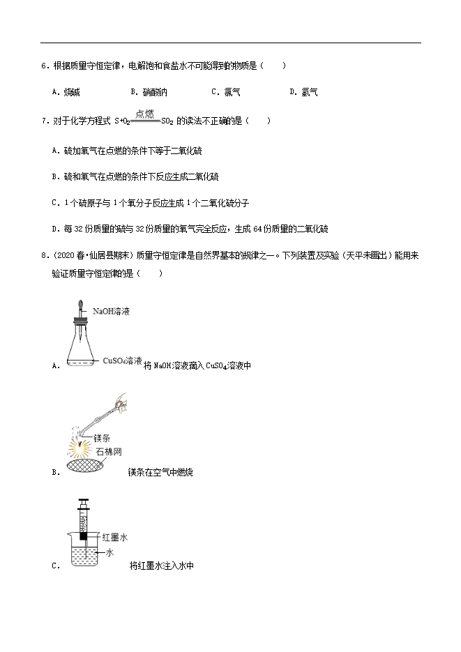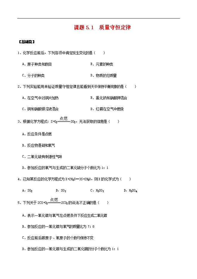 【内容简介】1.化学反应前后,下列各项中肯定发生变化的是( )A.原子种类和数目B.元素的种类C.分子的种类D.物质的总质量2.下列实验能用来验证质量守恒定律且能看到天平保持平衡现象的是( )A.在空气中对铜片加热B.氯化钠和硝酸钾混合C.铜和硝酸银溶液混合D.红磷在空气中燃烧3.根据化学方程式:S+O2 SO2,无法获取的信息是( )A.反应条件是点燃B.反应物是硫和氧气C.二氧化硫有刺激性气味D.参加反应的氧气与生成的二氧化硫分子个数比为1:14.已知某反应的化学方程式为X+2H2S═3S+2H2O,则X的化学式为( )A.SO2B.SO3C.H2SO3D.H2SO45.下列关于2CO+O2 2CO2的说法不正确的是( )A.表示一氧化碳与氧气在点燃条件下反应生成二氧化碳B.参加反应的一氧化碳与氧气的质量比为7:8C.反应前后碳原子、氧原子的个数均保持不变D.参加反应的一氧化碳与生成的二氧化碳的分子个数比为1:16.根据质量守恒定律,电解饱和食盐水不可能得到的物质是( )A.烧碱B.硝酸钠C.氯气D.氢气7.对于化学方程式 S+O2 SO2 的读法不正确的是( )A.硫加氧气在点燃的条件下等于二氧化硫......