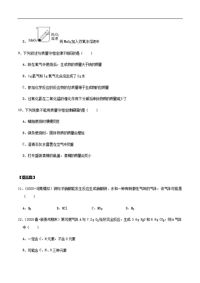 【精品】2021秋人教版初中化学《课题5.1 质量守恒定律》基础和提高练习(原卷版)