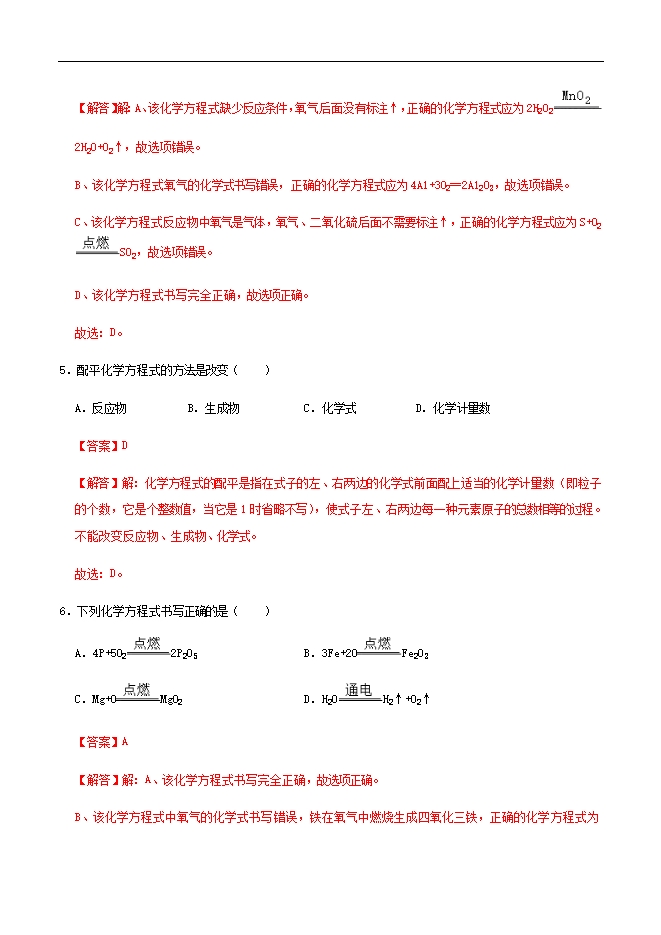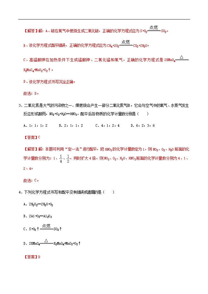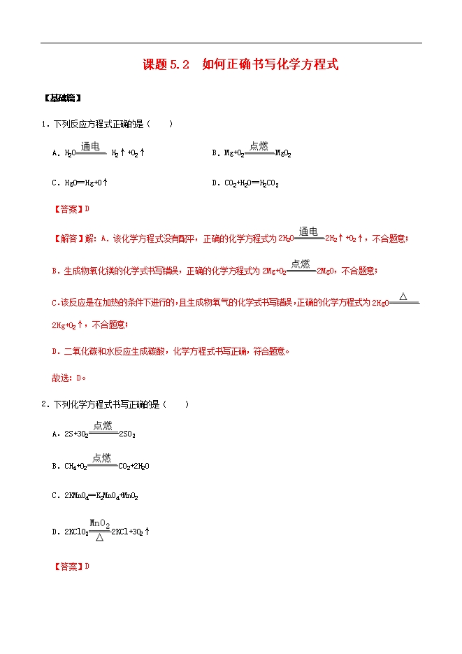 【内容简介】【基础篇】1.下列反应方程式正确的是( )A.H2O H2↑+O2↑B.Mg+O2 MgO2 C.HgO═Hg+O↑D.CO2+H2O═H2CO3【答案】D【解答】解:A.该化学方程式没有配平,正确的化学方程式为2H2O 2H2↑+O2↑,不合题意;B.生成物氧化镁的化学式书写错误,正确的化学方程式为2Mg+O2 2MgO,不合题意;C.该反应是在加热的条件下进行的,且生成物氧气的化学式书写错误,正确的化学方程式为2HgO 2Hg+O2↑,不合题意;D.二氧化碳和水反应生成碳酸,化学方程式书写正确,符合题意。故选:D。2.下列化学方程式书写正确的是( )A.2S+3O2 2SO3B.CH4+O2 CO2+2H2OC.2KMnO4═K2MnO4+MnO2D.2KClO3 2KCl+3O2↑【答案】D【解答】解:A、硫在氧气中燃烧生成二氧化硫,正确的化学方程式应为S+O2 SO2。B、该化学方程式配平错误,正确的化学方程式应为CH4+2O2 CO2+2H2O。C、高锰酸钾在加热条件下生成锰酸钾、二氧化锰和氧气,正确的化学方程式是2KMnO4 K2MnO4+MnO2+O2↑。D、该化学方程式书写完全正确。故选:D。3.二氧化氮是大气的污染物之一.煤燃烧会产生一部分二氧化氮气体,它会与空气中的氧气、水蒸气发生反应形成酸雨,NO2+O2+H2O═HNO3,配平后各物质的化学计量数分别是( )A.1,1,1,2B.2,1,1,2C.4,1,2,4D.6,2,3,6【答案】C【解答】解:本题可利用“定一法”进行配平,把HNO3的化学计量数定为1,则NO2、O2、H2O前面的化学计量数分别为:1、 、 ,同时扩大4倍,则NO2、O2、H2O、HNO3前面的化学计量数分别为4、1、2、4。故选:C。4.下列化学方程式书写和配平没有错误或遗漏的是( )A.2H2O2═2H2O+O2B.2A1+O3═A12O3C.S+O2↑ SO2↑D.2KMnO4 K2MnO4+MnO2+O2↑【答案】D......