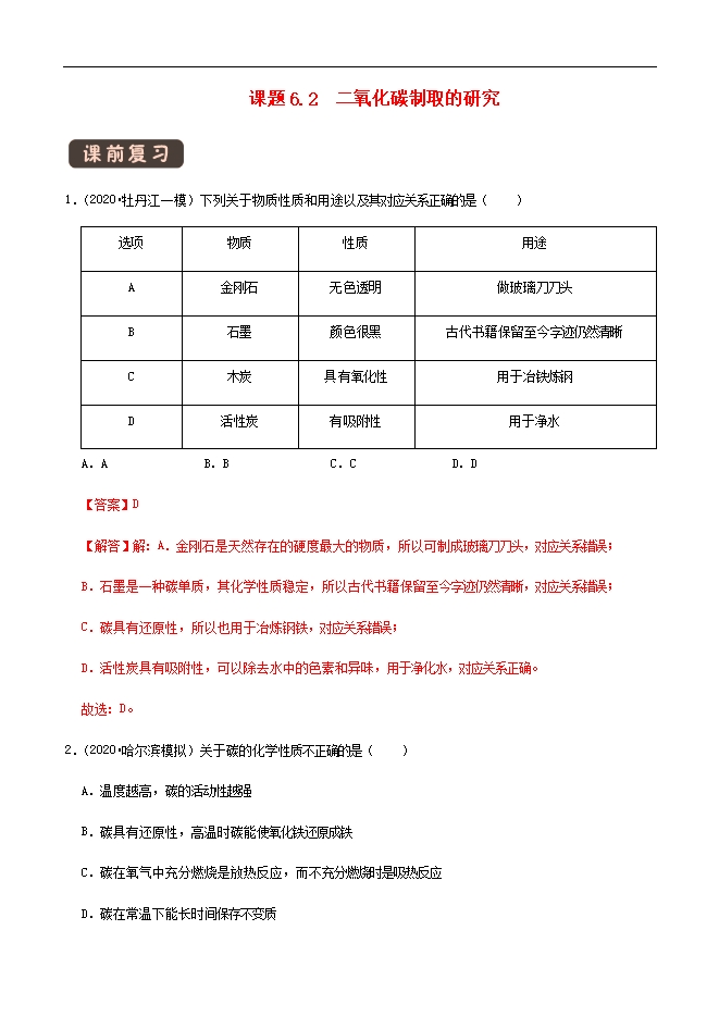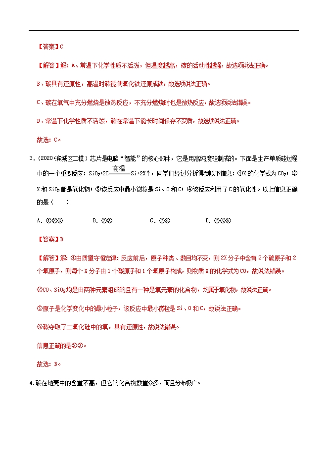 【内容简介】下列关于物质性质和用途以及其对应关系正确的是( ) 选项物质性质用途A金刚石无色透明做玻璃刀刀头B石墨颜色很黑古代书籍保留至今字迹仍然清晰C木炭具有氧化性用于冶铁炼钢D活性炭有吸附性用于净水A.AB.BC.CD.D【答案】D【解答】解:A.金刚石是天然存在的硬度最大的物质,所以可制成玻璃刀刀头,对应关系错误;B.石墨是一种碳单质,其化学性质稳定,所以古代书籍保留至今字迹仍然清晰,对应关系错误;C.碳具有还原性,所以也用于冶炼钢铁,对应关系错误;D.活性炭具有吸附性,可以除去水中的色素和异味,用于净化水,对应关系正确。故选:D。2.(2020•哈尔滨模拟)关于碳的化学性质不正确的是( )A.温度越高,碳的活动性越强B.碳具有还原性,高温时碳能使氧化铁还原成铁C.碳在氧气中充分燃烧是放热反应,而不充分燃烧时是吸热反应D.碳在常温下能长时间保存不变质【答案】C【解答】解:A、常温下化学性质不活泼,但温度越高,碳的活动性越强,故选项说法正确。B、碳具有还原性,高温时碳能使氧化铁还原成铁,故选项说法正确。C、碳在氧气中充分燃烧是放热反应,不充分燃烧时也是放热反应,故选项说法错误。D、常温下化学性质不活泼,碳在常温下能长时间保存不变质,故选项说法正确。故选:C。3.(2020•滨城区二模)芯片是电脑“智能”的核心部件,它是用高纯度硅制成的。下面是生产单质硅过程中的一个重要反应:SiO2+2C Si+2X↑,同学们经过分析得到以下信息:①X的化学式为CO2;②X和SiO2都是氧化物;③该反应中最小微粒是Si、O和C;④该反应利用了C的氧化性。以上信息正确的是( )A.①②③B.②③C.②④D.②③④【答案】B【解答】解:①由质量守恒定律:反应前后,原子种类、数目均不变,则2X分子中含有2个碳原子和2个氧原子,则每个X分子由1个碳原子和1个氧原子构成,则物质X的化学式为CO,故说法错误。②CO、SiO2均是由两种元素组成的且有一种是氧元素的化合物,均属于氧化物,故说法正确。③原子是化学变化中的最小粒子,该反应中最小微粒是Si、O和C,故说法正确。④碳夺取了二氧化硅中的氧,具有还原性,故说法错误。信息正确的是②③。故选:B。4.碳在地壳中的含量不高,但它的化合物数量众多,而且分布极广。......
