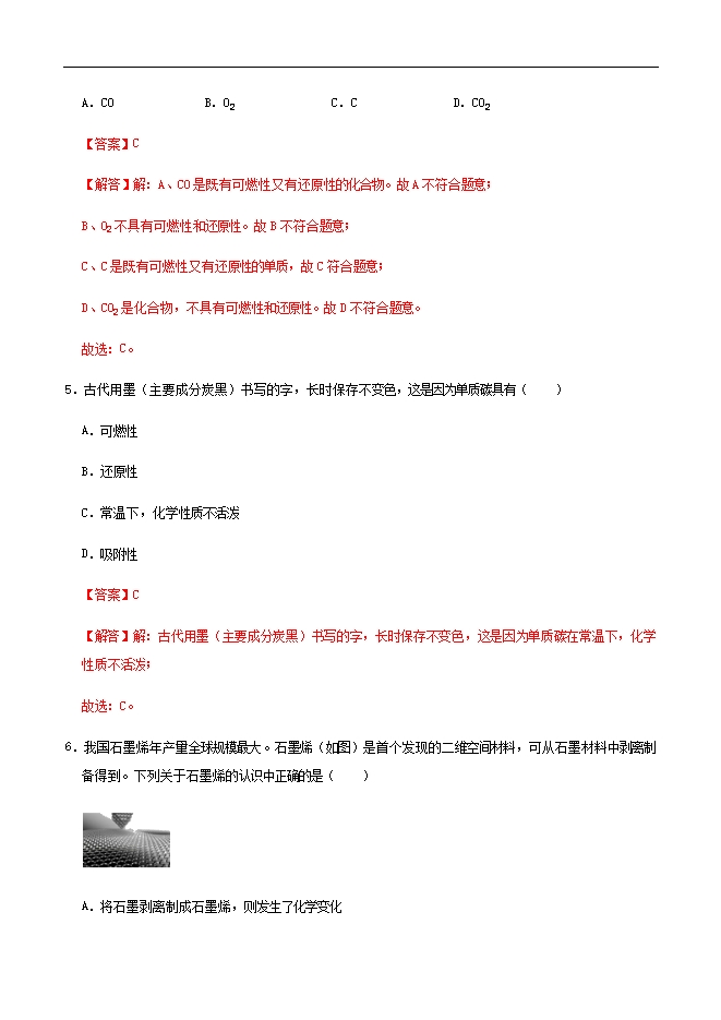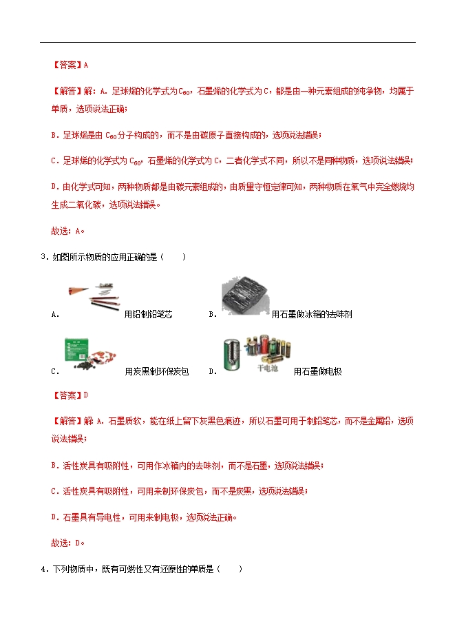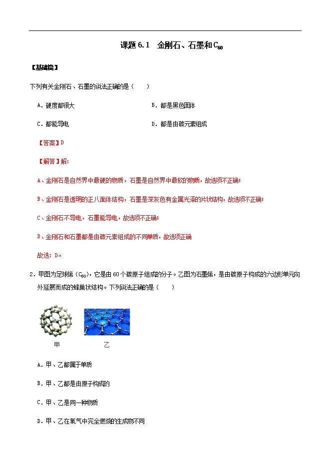 【内容简介】.下列有关金刚石、石墨的说法正确的是( )A.硬度都很大B.都是黑色固体C.都能导电D.都是由碳元素组成【答案】D【解答】解:A、金刚石是自然界中最硬的物质,石墨是自然界中最软的物质,故选项不正确;B、金刚石是透明的正八面体结构,石墨是深灰色有金属光泽的片状结构,故选项不正确;C、金刚石不导电,石墨能导电,故选项不正确;D、金刚石和石墨都是由碳元素组成的不同单质,故选项正确故选:D。2.甲图为足球烯(C60),它是由60个碳原子组成的分子。乙图为石墨烯,是由碳原子构成的六边形单元向外延展而成的蜂巢状结构。下列说法正确的是( ) A.甲、乙都属于单质B.甲、乙都是由原子构成的C.甲、乙是同一种物质D.甲、乙在氧气中完全燃烧的生成物不同【答案】A【解答】解:A.足球烯的化学式为C60,石墨烯的化学式为C,都是由一种元素组成的纯净物,均属于单质,选项说法正确;B.足球烯是由C60分子构成的,而不是由碳原子直接构成的,选项说法错误;C.足球烯的化学式为C60,石墨烯的化学式为C,二者化学式不同,所以不是同种物质,选项说法错误;D.由化学式可知,两种物质都是由碳元素组成的,由质量守恒定律可知,两种物质在氧气中完全燃烧均生成二氧化碳,选项说法错误。故选:A。3.如图所示物质的应用正确的是( )A. 用铅制铅笔芯B. 用石墨做冰箱的去味剂C. 用炭黑制环保炭包D. 用石墨做电极【答案】D【解答】解:A.石墨质软,能在纸上留下灰黑色痕迹,所以石墨可用于制铅笔芯,而不是金属铅,选项说法错误;B.活性炭具有吸附性,可用作冰箱内的去味剂,而不是石墨,选项说法错误;C.活性炭具有吸附性,可用来制环保炭包,而不是炭黑,选项说法错误;D.石墨具有导电性,可用来制电极,选项说法正确。故选:D。......