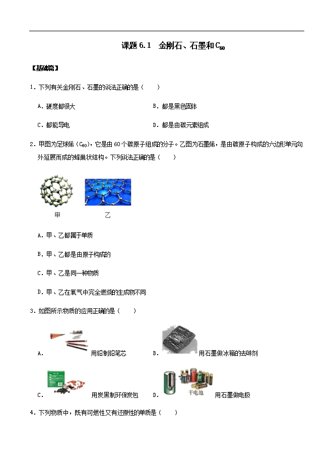 【精品】2021秋人教版初中化学《课题6.1 金刚石、石墨和C60》基础和提高练习(原卷版)