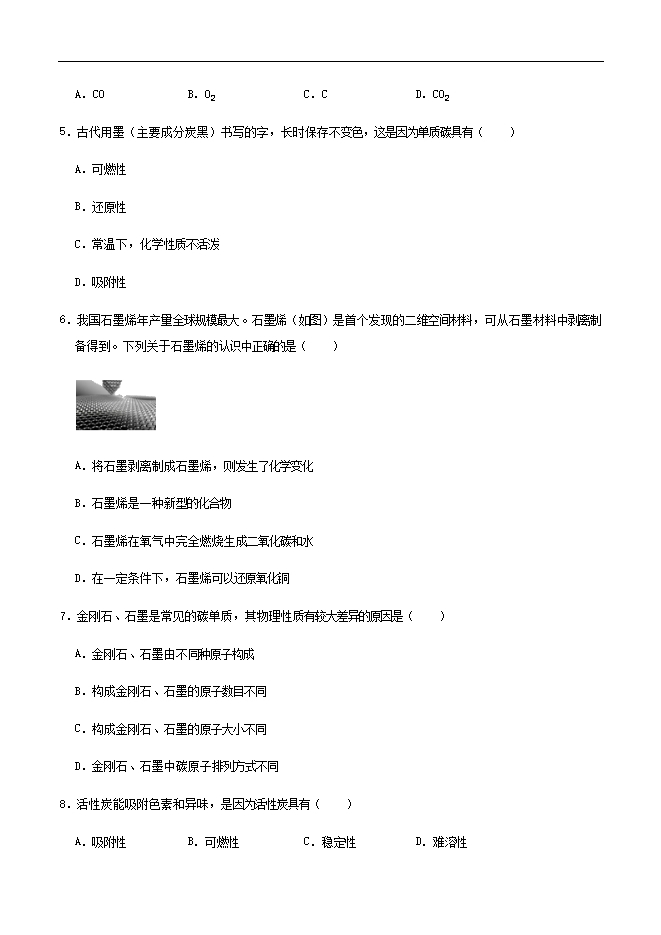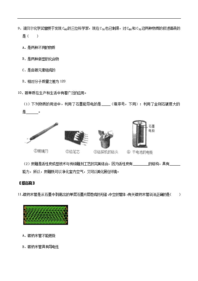 【内容简介】1.下列有关金刚石、石墨的说法正确的是( )A.硬度都很大B.都是黑色固体C.都能导电D.都是由碳元素组成2.甲图为足球烯(C60),它是由60个碳原子组成的分子。乙图为石墨烯,是由碳原子构成的六边形单元向外延展而成的蜂巢状结构。下列说法正确的是( )A.甲、乙都属于单质B.甲、乙都是由原子构成的C.甲、乙是同一种物质D.甲、乙在氧气中完全燃烧的生成物不同3.如图所示物质的应用正确的是( )A. 用铅制铅笔芯B. 用石墨做冰箱的去味剂C. 用炭黑制环保炭包D. 用石墨做电极4.下列物质中,既有可燃性又有还原性的单质是( )A.COB.O2C.CD.CO25.古代用墨(主要成分炭黑)书写的字,长时保存不变色,这是因为单质碳具有( )A.可燃性B.还原性C.常温下,化学性质不活泼D.吸附性6.我国石墨烯年产量全球规模最大。石墨烯(如图)是首个发现的二维空间材料,可从石墨材料中剥离制备得到。下列关于石墨烯的认识中正确的是( ) A.将石墨剥离制成石墨烯,则发生了化学变化B.石墨烯是一种新型的化合物C.石墨烯在氧气中完全燃烧生成二氧化碳和水D.在一定条件下,石墨烯可以还原氧化铜7.金刚石、石墨是常见的碳单质,其物理性质有较大差异的原因是( )A.金刚石、石墨由不同种原子构成B.构成金刚石、石墨的原子数目不同C.构成金刚石、石墨的原子大小不同D.金刚石、石墨中碳原子排列方式不同8.活性炭能吸附色素和异味,是因为活性炭具有( )A.吸附性B.可燃性C.稳定性D.难溶性9.诺贝尔化学奖曾授于发现C60的三位科学家,现在C70也已制得,对C60和C70这两种物质的叙述错误的是( )A.是两种不同的物质B.是两种新型的化合物C.是由碳元素组成的D.相对分子质量之差为120......