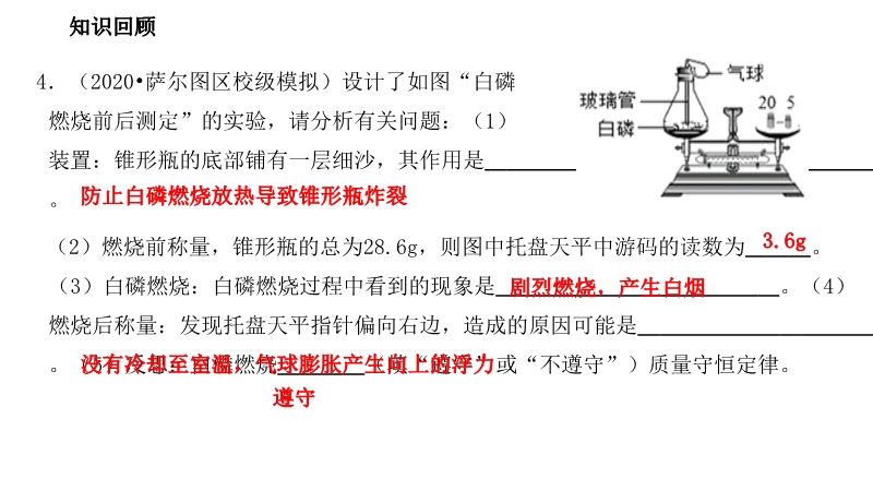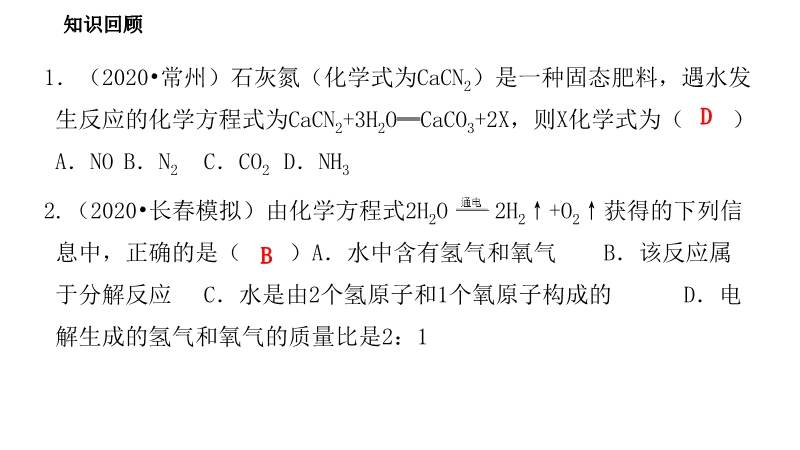 【内容简介】1.(石灰氮(化学式为CaCN2)是一种固态肥料,遇水发生反应的化学方程式为CaCN2+3H2O═CaCO3+2X,则X化学式为( )A.NOB.N2 C.CO2D.NH32. 由化学方程式2H2O 2H2↑+O2↑获得的下列信息中,正确的是( )A.水中含有氢气和氧气B.该反应属于分解反应C.水是由2个氢原子和1个氧原子构成的D.电解生成的氢气和氧气的质量比是2:1(2)燃烧前称量,锥形瓶的总为28.6g,则图中托盘天平中游码的读数为 。(3)白磷燃烧:白磷燃烧过程中看到的现象是 。(4)燃烧后称量:发现托盘天平指针偏向右边,造成的原因可能是 。(5)反思:白磷燃烧 (填“遵守”或“不遵守”)质量守恒定律。......