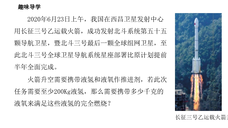 【内容简介】将实验室制取二氧化碳的废液过滤后,向其滤液中加入碳酸钠溶液(Na2CO3),会发生如下反应:反应①:Na2CO3+2HCl═2NaCl+H2O+X反应②: Na2CO3+ CaCl2═ CaCO3↓+ NaCl(1)反应①中X的化学式是 。(2)反应②还没有配平,请在横线上填上配平后的化学计量数。2020年6月23日上午,我国在西昌卫星发射中心用长征三号乙运载火箭,成功发射北斗系统第五十五颗导航卫星,暨北斗三号最后一颗全球组网卫星,至此北斗三号全球卫星导航系统星座部署比原计划提前半年全面完成。火箭升空需要携带液氢和液氧作推进剂,若此次任务需要至少200Kg液氢,那么需要携带多少千克的液氧来满足这些液氢的完全燃烧?......