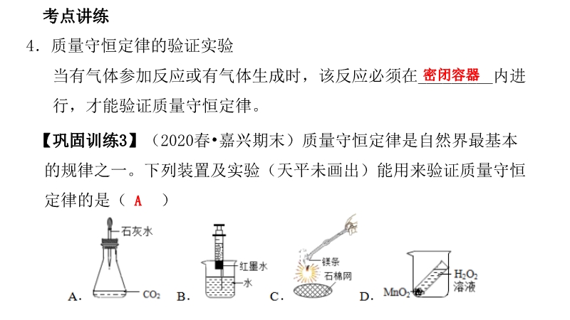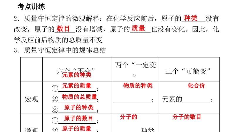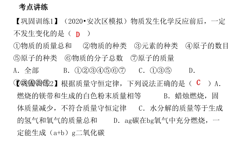 【内容简介】【巩固训练1】(2020•安次区模拟)物质发生化学反应前后,一定不发生变化的是( )①物质的质量总和 ②物质的种类 ③元素的种类 ④原子的数目⑤原子的种类 ⑥物质的分子总数 ⑦原子的质量A.全部B.①②③④⑤⑥⑦C.①③⑤D.①③④⑤⑦巩固训练2】根据质量守恒定律,下列说法正确的是( )A.燃烧的镁带和生成的白色粉末质量相等B.蜡烛燃烧,固体质量减少,不符合质量守恒定律C.水分解的质量等于生成的氢气和氧气的质量总和D.ag碳在bg氧气中充分燃烧,一定能生成(a+b)g二氧化碳......