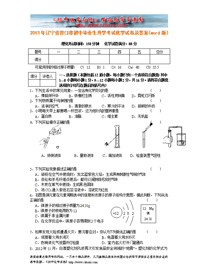 2013年辽宁省营口市初中毕业生升学考试化学试卷及答案(word版)