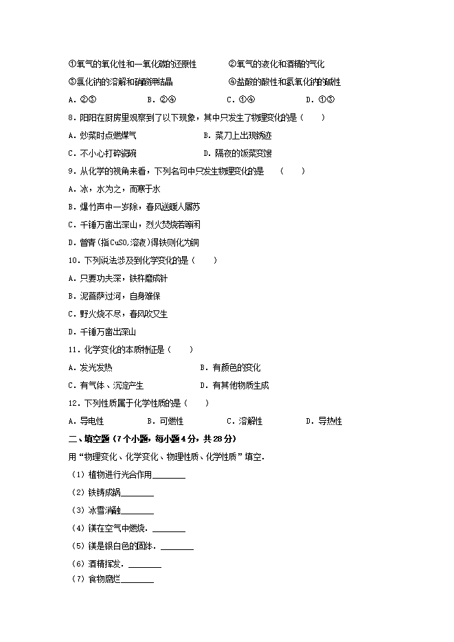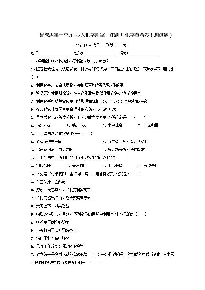 鲁教版第一单元 步入化学殿堂 课题1 化学真奇妙(测试题)