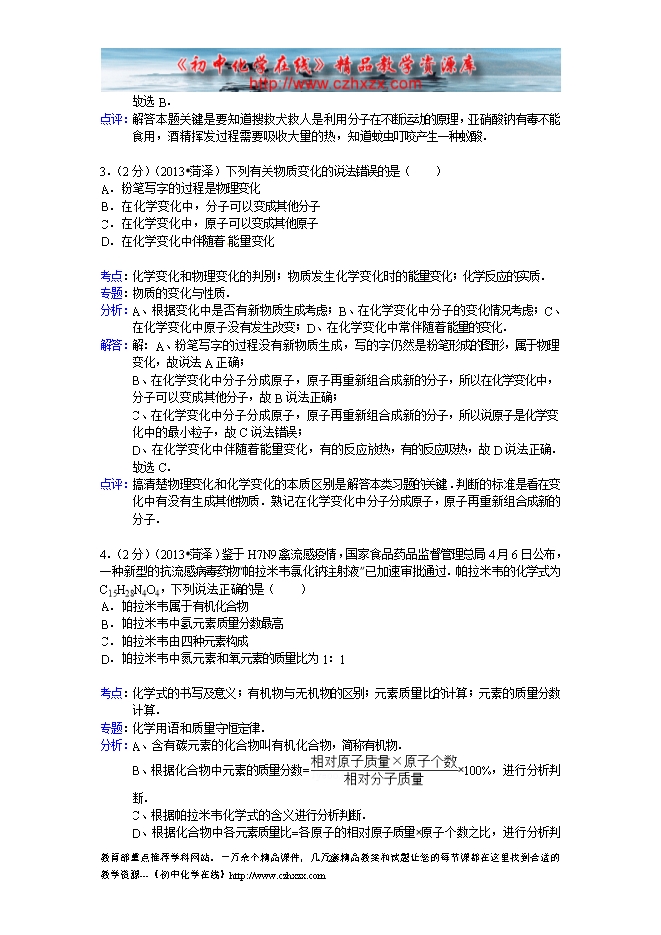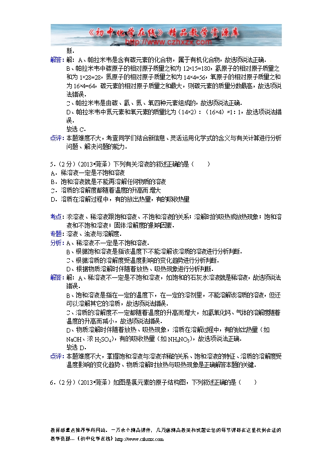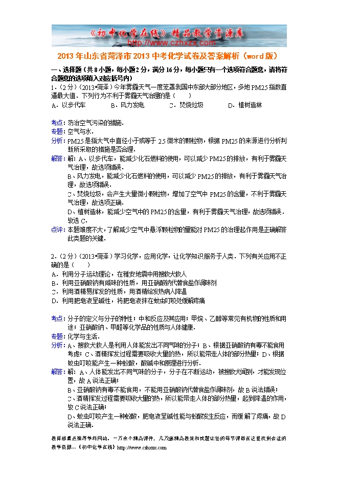 2013年山东省菏泽市2013中考化学试卷及答案解析(word版)