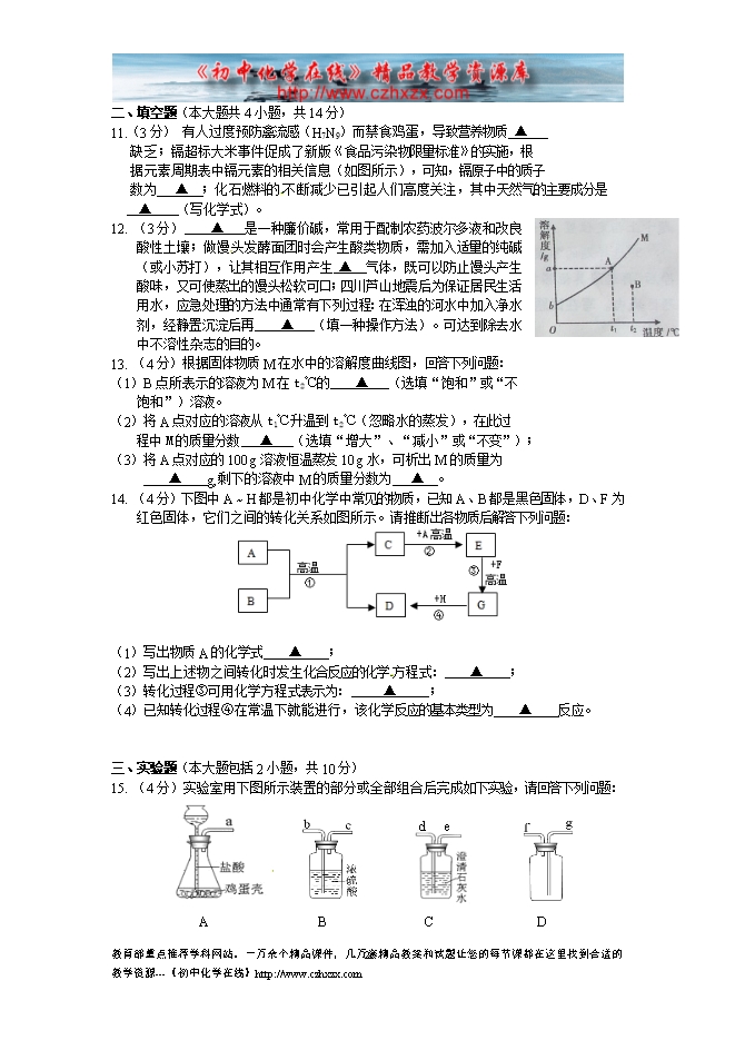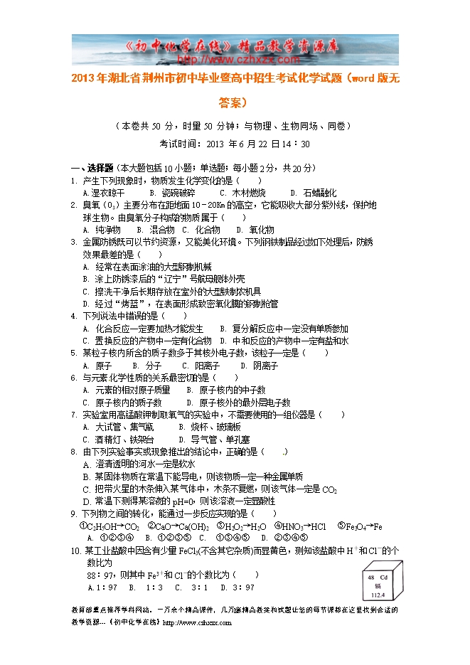 2013年湖北省荆州市初中毕业暨高中招生考试化学试题(word版无答案)