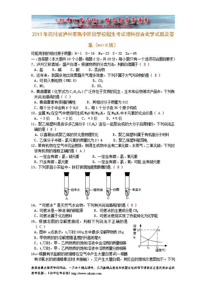 2013年四川省泸州市高中阶段学校招生考试理科综合化学试题及答案(word版)