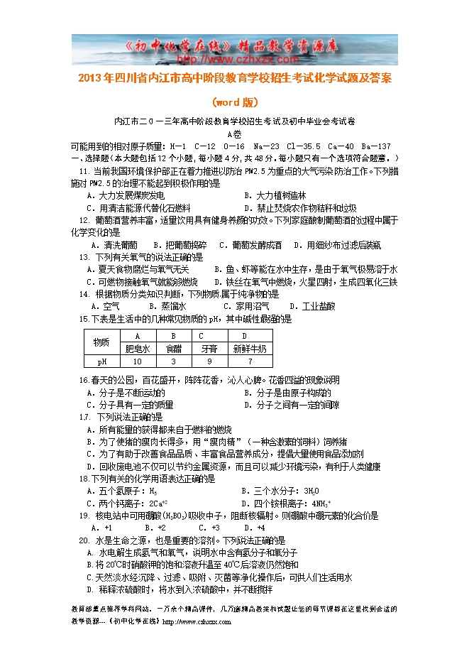 2013年四川省内江市高中阶段教育学校招生考试化学试题及答案(word版)