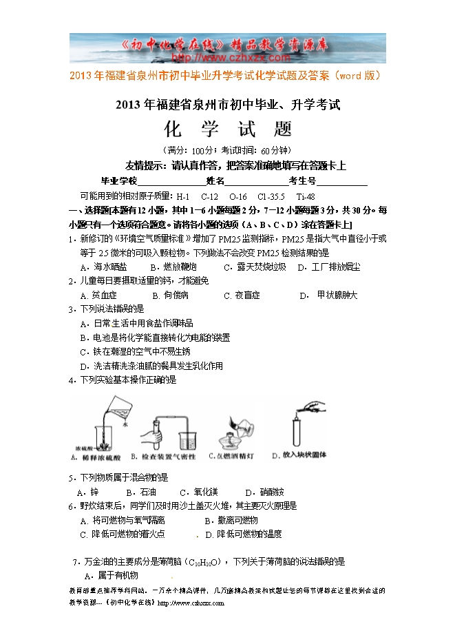2013年福建省泉州市初中毕业升学考试化学试题及答案(word版)