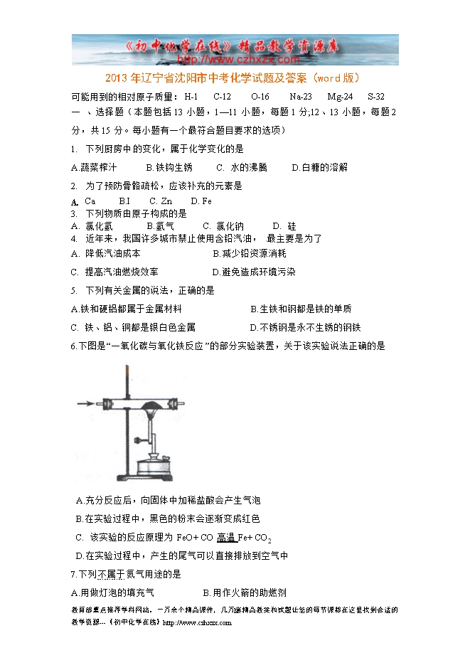 2013年辽宁省沈阳市中考化学试题及答案(word版)