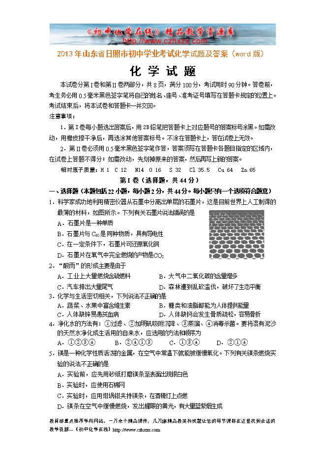 2013年山东省日照市初中学业考试化学试题及答案(word版)