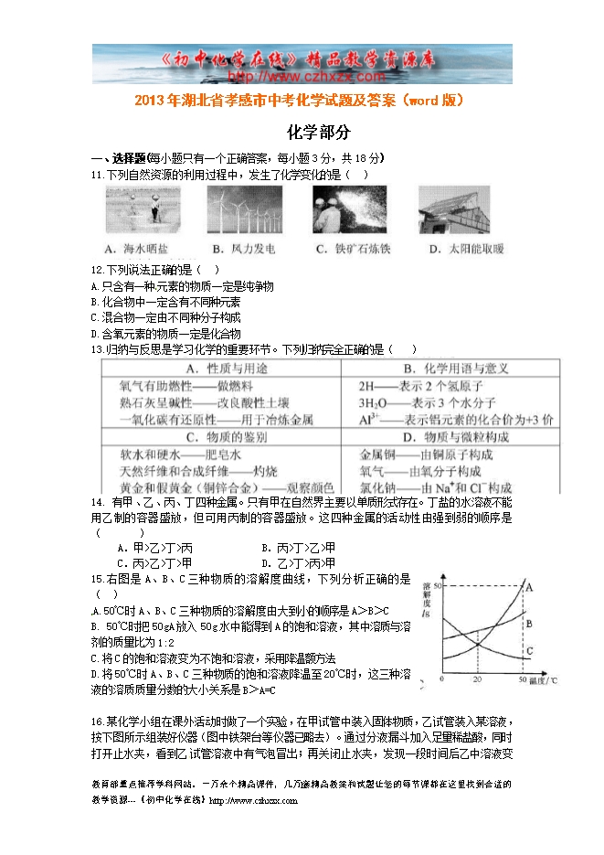 2013年湖北省孝感市中考化学试题及答案(word版)
