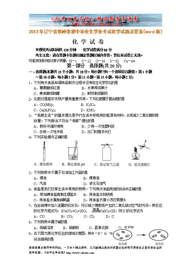 2013年辽宁省铁岭市初中毕业生学业考试化学试题及答案(word版)