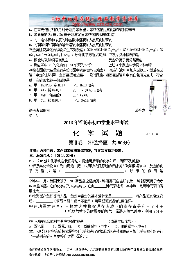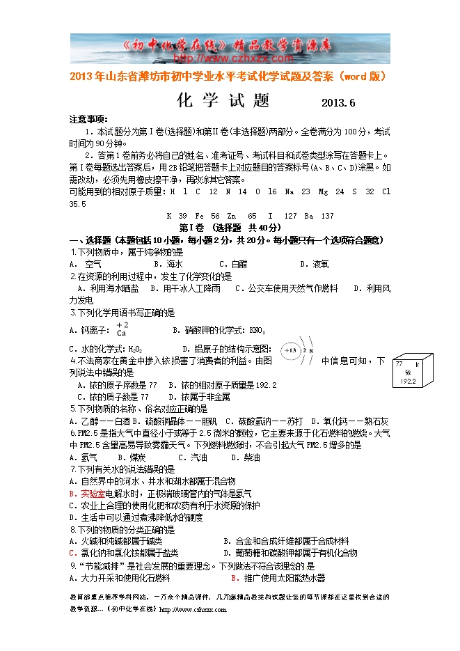 2013年山东省潍坊市初中学业水平考试化学试题及答案(word版)