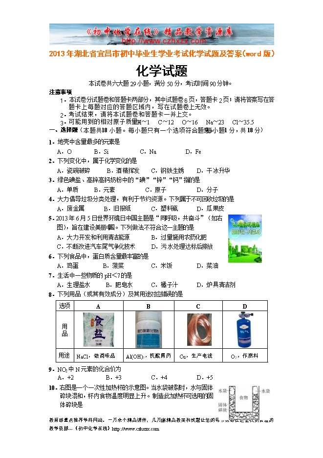 2013年湖北省宜昌市初中毕业生学业考试化学试题及答案(word版)