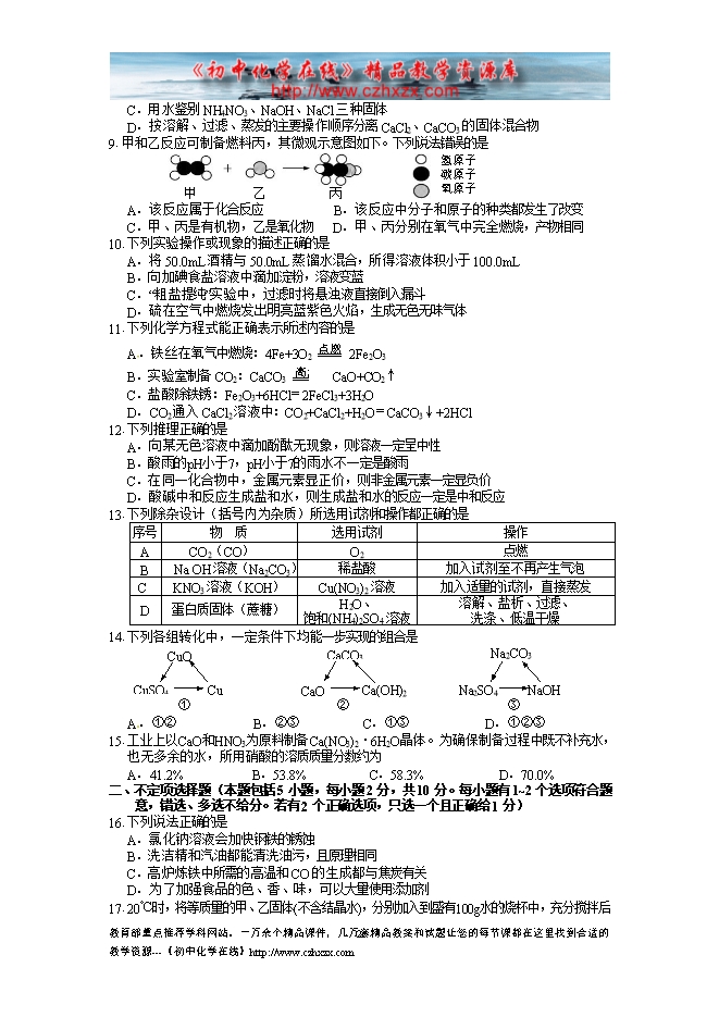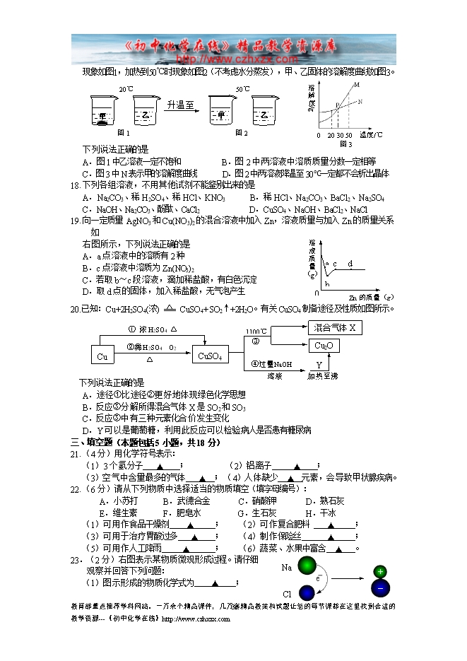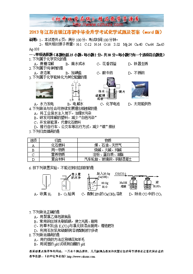2013年江苏省镇江市初中毕业升学考试化学试题及答案(word版)