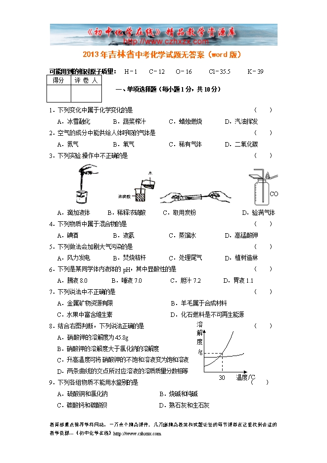 2013年吉林省中考化学试题无答案(word版)