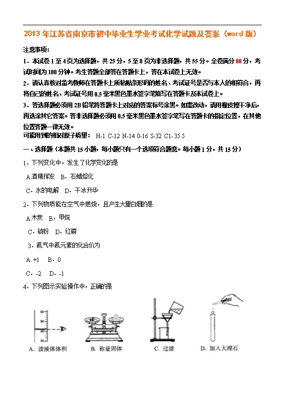 2013年江苏省南京市初中毕业生学业考试化学试题及答案(word版)