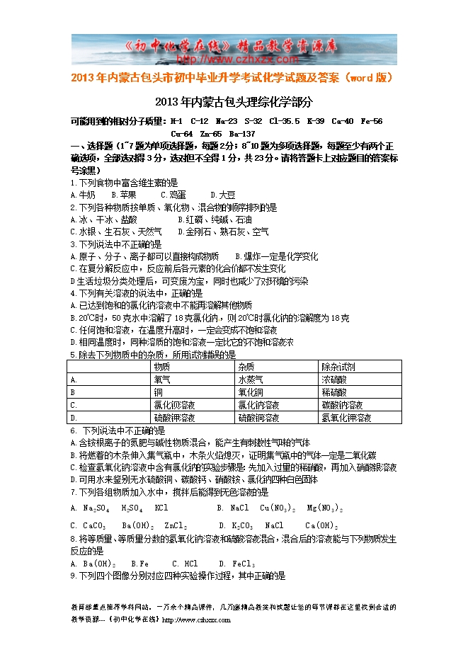 2013年内蒙古包头市初中毕业升学考试化学试题及答案(word版)