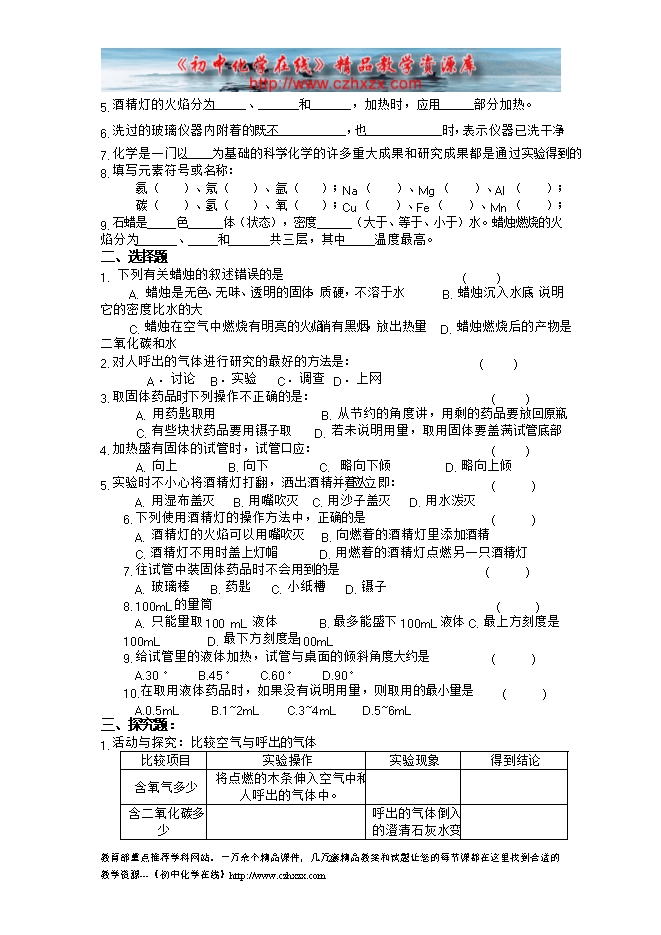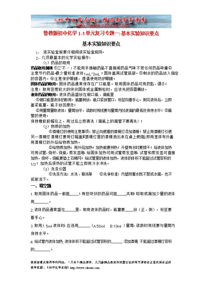鲁教版初中化学1-3单元复习专题一:基本实验知识要点