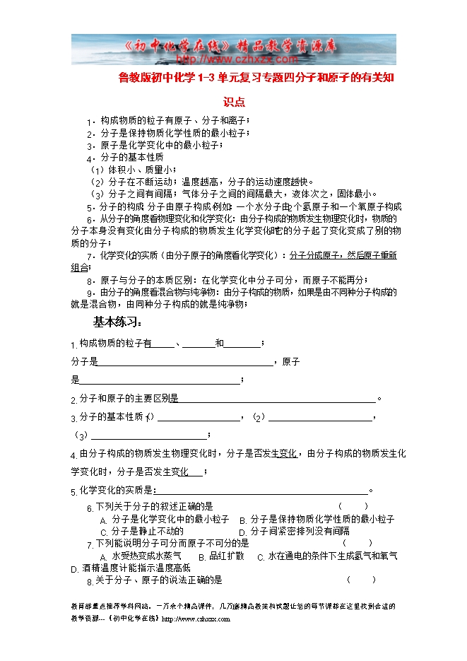 鲁教版初中化学1-3单元复习专题四分子和原子的有关知识点