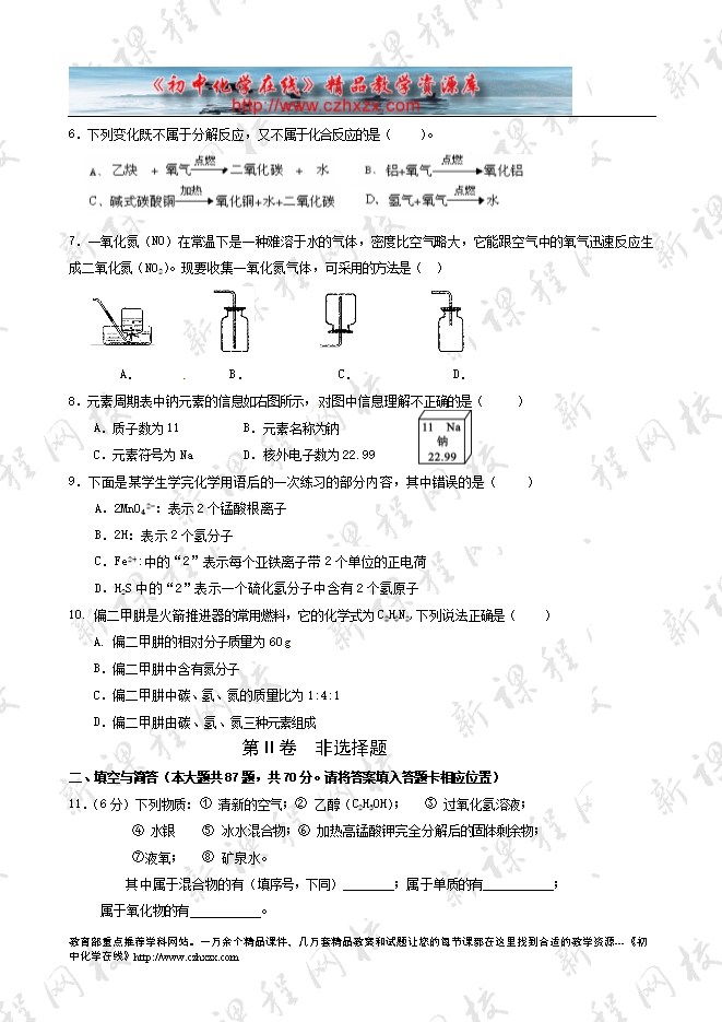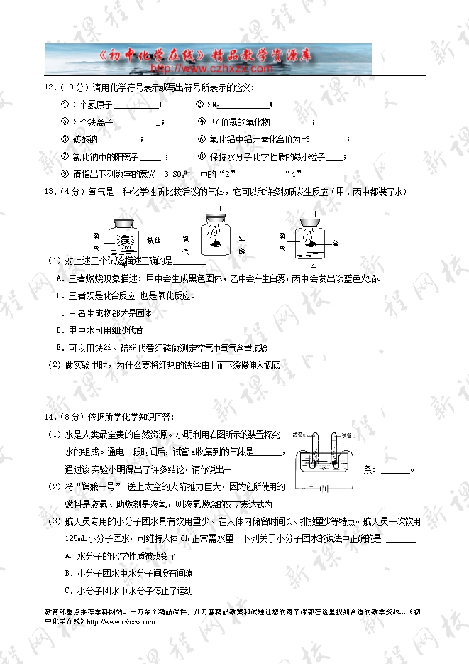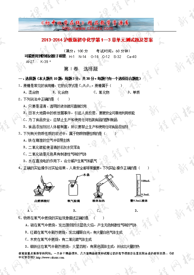 2013-2014沪教版初中化学第1--3章单元测试题及答案