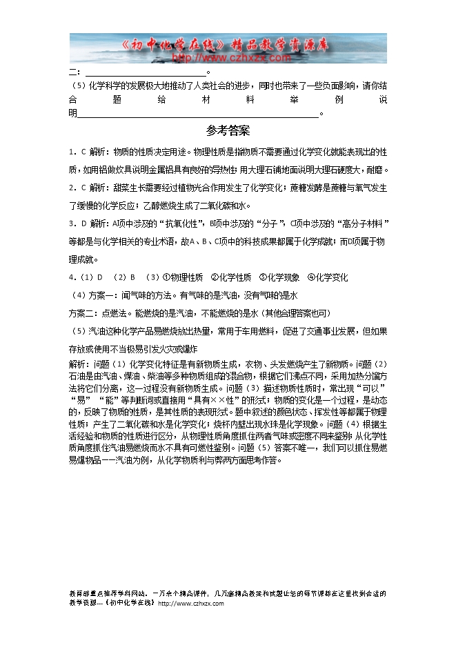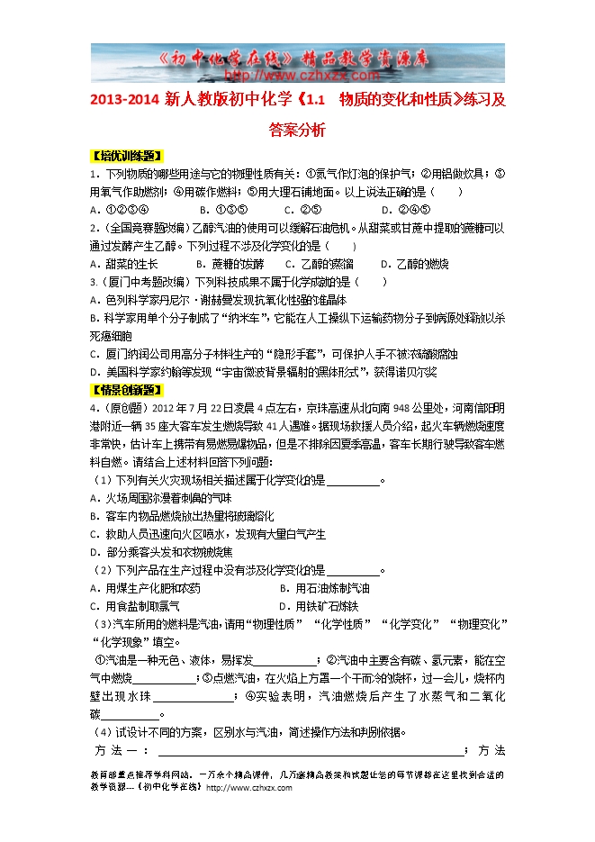 2013-2014新人教版初中化学《1.1 物质的变化和性质》练习及答案分析